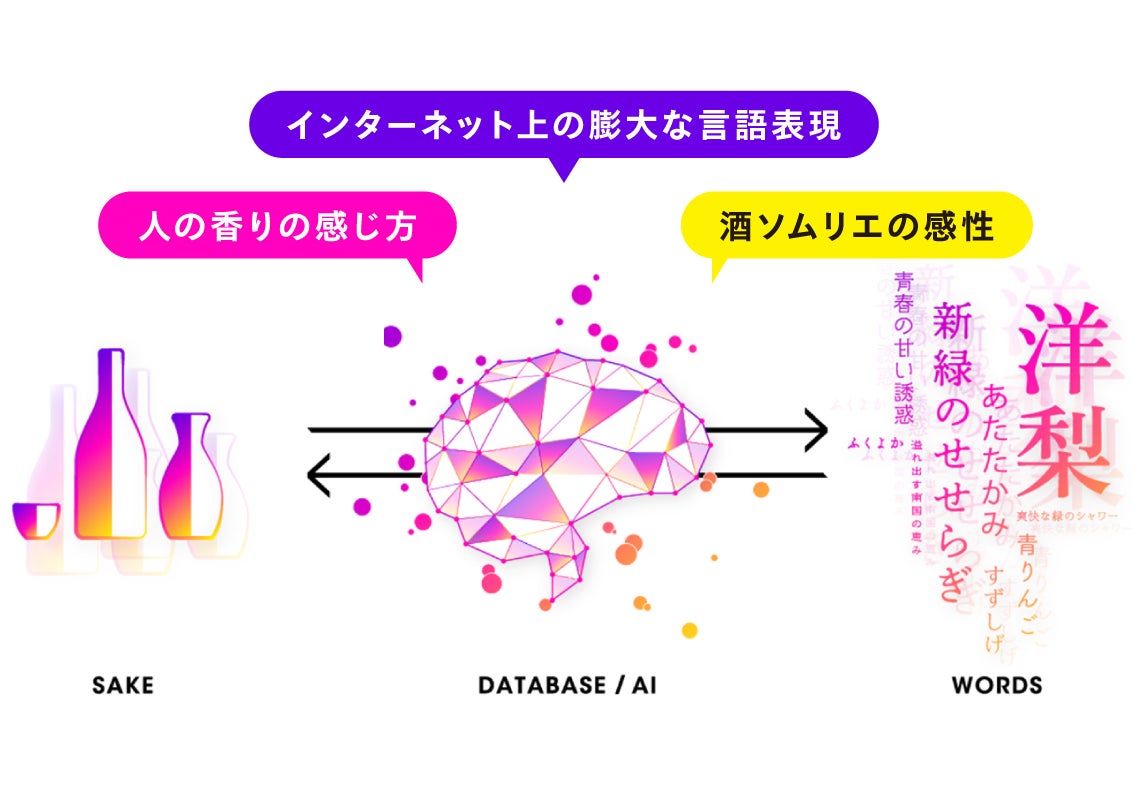 KAORIUM for Sakeは、膨大な言語表現と人の香りの感じ方に合わせて、1万以上の日本酒の風味・感性データと酒ソムリエの感性を学習した最先端のAIシステム。AIが持つ膨大な日本酒の風味データによって、最高の“人とお酒”のマッチングを導き出すことができます。そのため、一人ひとりの好みに合った日本酒を探せたり、料理に合うお酒を見つけることができ、新しい日本酒との出逢いや愉しみを提供することができます。