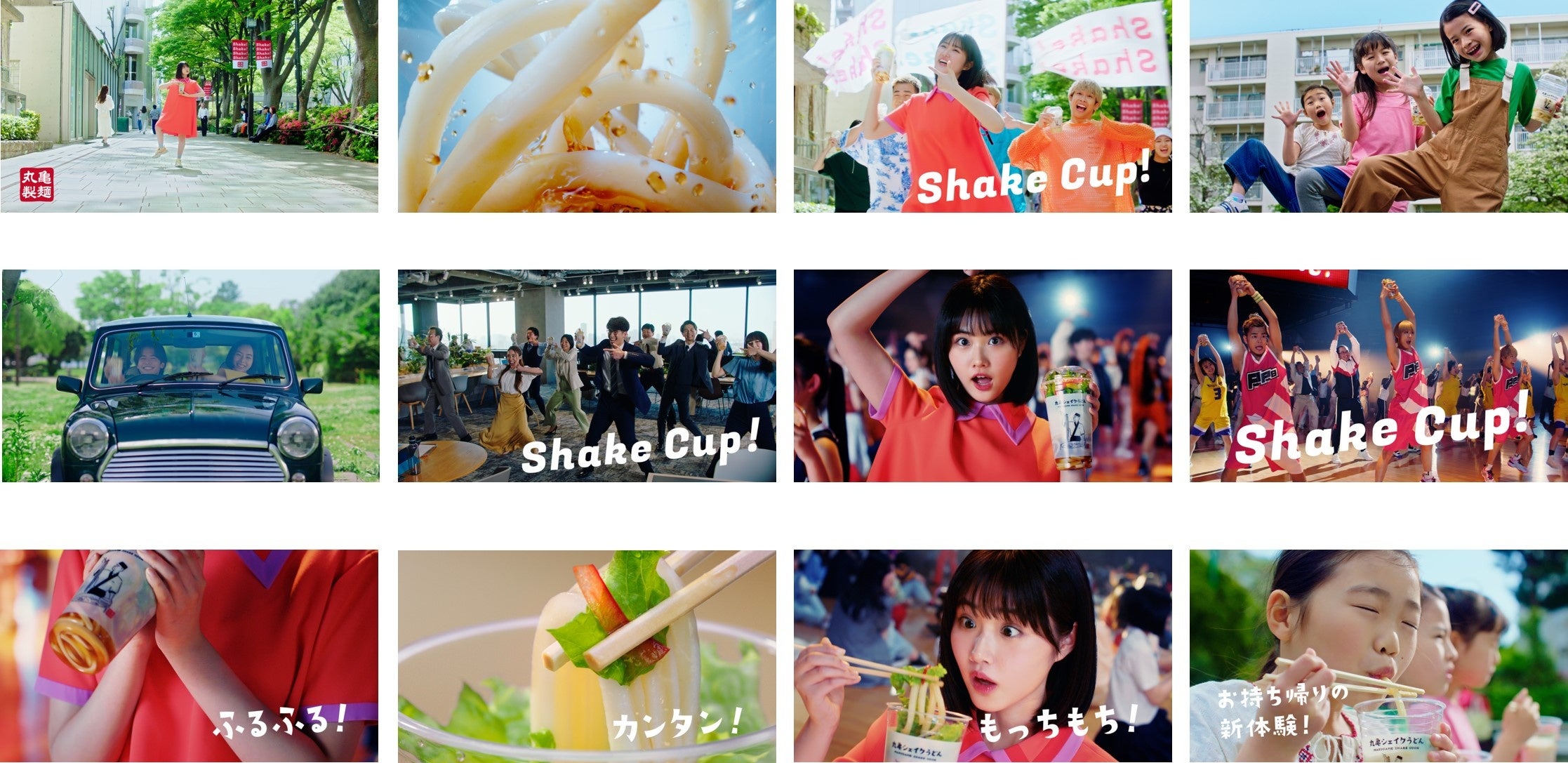 街中を歩いていると、まるでフラッシュモブのように次々とダンサーたちが加わり 「丸亀シェイクうどん」を持ってダンスを楽しみます。オフィスやスケートパーク、車の中や工事現場など様々な場所で、オフィスワーカーや子供たちがうどんをみんなでシェイク。そして、わくわくした表情でカップの中のうどんをほおばり、幸せそうに「丸亀シェイクうどん」を味わいます。