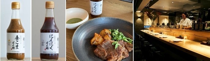 今回は、マルカン酢の魅力をより堪能できる逸品として、化学調味料を使用せず、素材の味を最大限に引き出した「お酢屋がつくった ぽん酢シリーズ」を使用。濃厚な香りと深いコクが特長の金ごまと黒酢が旨味を広げる「お酢屋がつくった 金ごまぽん酢」を使った冷菜「帆立と鮮魚、ズッキーニのセビーチェ 金胡麻ぽん酢仕立て」と、主に青森県産にんにくを使い、ガツンとした味わいに仕上げた「お酢屋がつくった にんにくぽん酢」を使ったメインディッシュ「ニュージーランド産リブロースの炭火焼き にんにくぽん酢のグリーンソース」をラインナップしています。さらに、『渋谷本店』では、この2品と『IGOR COSY』でも特に人気の料理が楽しめる贅沢な特別コースもご用意しています。