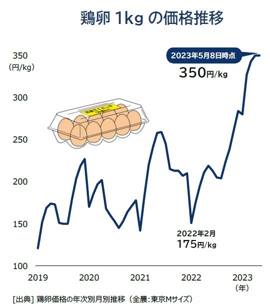 JA全農たまごによれば、4月の鶏卵1kg(東京Mサイズ)の卸売価格は350円で、前年同月から139円値上がりするなど高止まりが続いた。足元では供給不足や価格高騰の長期化を前提にした代替メニュー開発の動きも広がるほか、加工用殻付き卵の輸入も始まっており、外食産業の「エッグショック」への抵抗力は高まっていくと考えられる。