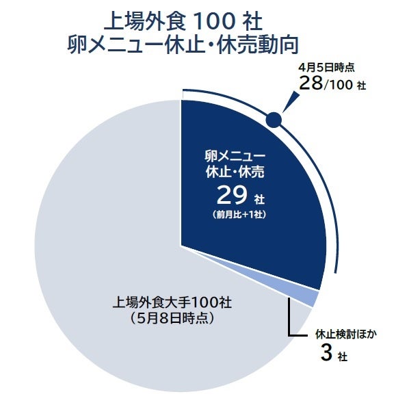 鳥インフルエンザの感染拡大に伴う卵の供給不足や価格高騰など、いわゆる「エッグショック」の影響が今なお続いている。上場する外食大手100社のうち、2023年に入って卵メニューの休止や休売に踏み切った、または表明した企業は、5月8日時点で少なくとも29社に上ることが分かった。前月からは新たに1社増えた。