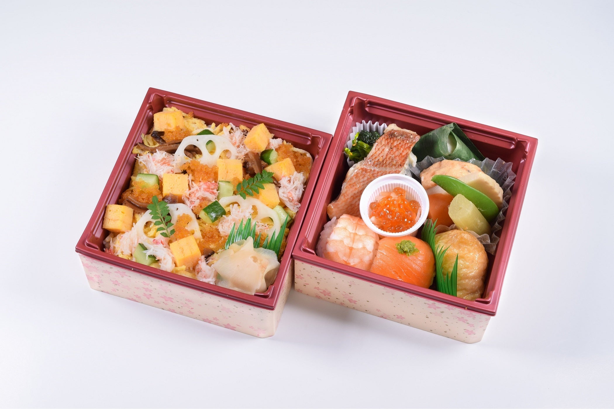 海老と赤魚をメインに、彩り豊かな食材を詰めた“おかず段”と、ちらし寿司を詰めた“ご飯段”の2段弁当です。
