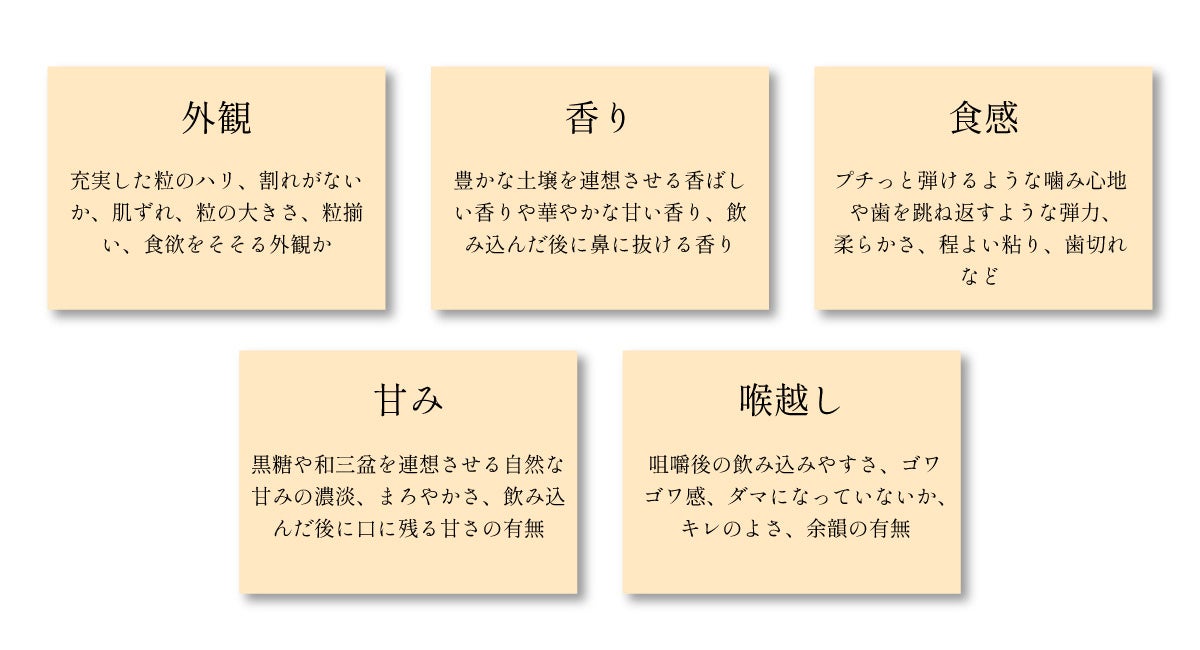 本グランプリでは、食味計や味度計など機械審査は一切行わず、予選から全て土鍋で炊いたお米を実際に食し、すべて官能審査にてお米を評価します。審査は下記5項目に加え、審査員毎に「玄米の扱いやすさ」「トータルバランス」など加点項目を設定し、評価します。