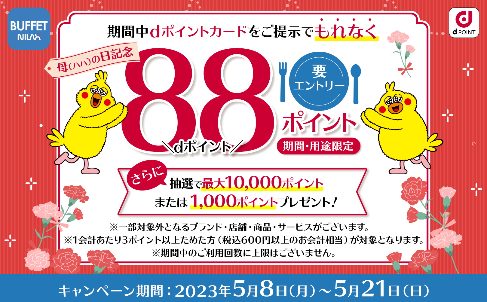 この度、2023年5月8日(月)~ 2023年5月21日(日)迄の期間限定にて、母(ハハ)の日にちなんで『dポイント88ポイントプレゼントキャンペーン』を開催!