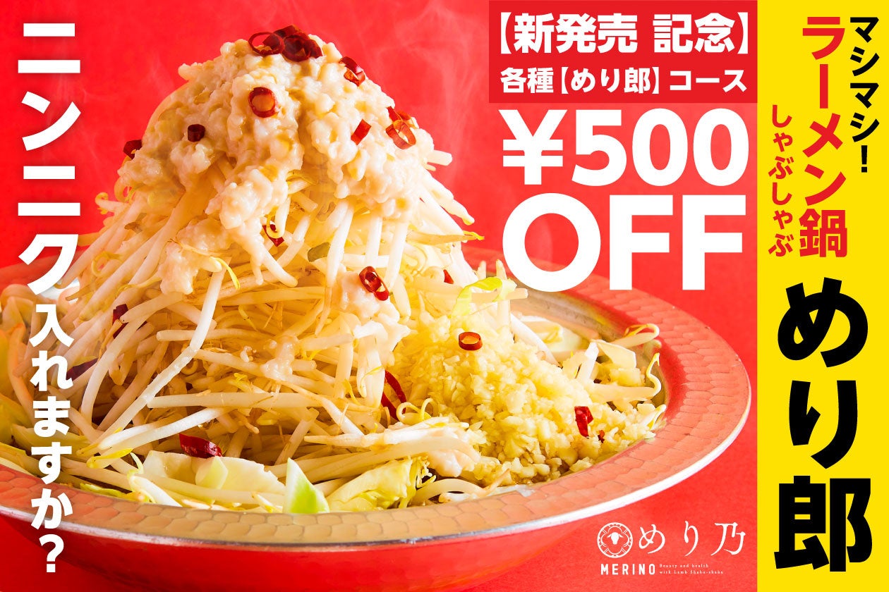 【めり郎】の提供開始を記念して、2023年5月16日(火)~24日(水)の期間限定で、対象のコースを500円引きで提供いたします。