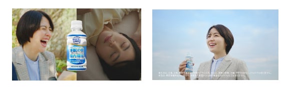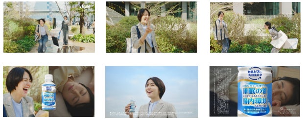 CMは社会人役の長澤さんと後輩との日常シーンからスタートします。雨上がりの商談帰りに水たまりができているのを見て、元気にジャンプして飛び越え、笑顔でピースをする長澤さん。続いて後輩もジャンプしようと手に持っている紙袋をふったところ、重みに耐えられず紙袋が破れてしまうトラブルが発生しますが、長澤さんは後輩と一緒に笑顔でトラブルを笑い飛ばします。笑顔の秘訣は“いい睡眠をとっているから”と言わんばかりに長澤さんの寝ている姿がインサートされ、続いて青空の下でおいしそうに『届く強さの乳酸菌W(ダブル)』を飲む長澤さんの姿が描かれます。最後は、いい睡眠で寝返りをうつ長澤さんの姿で締めくくります。