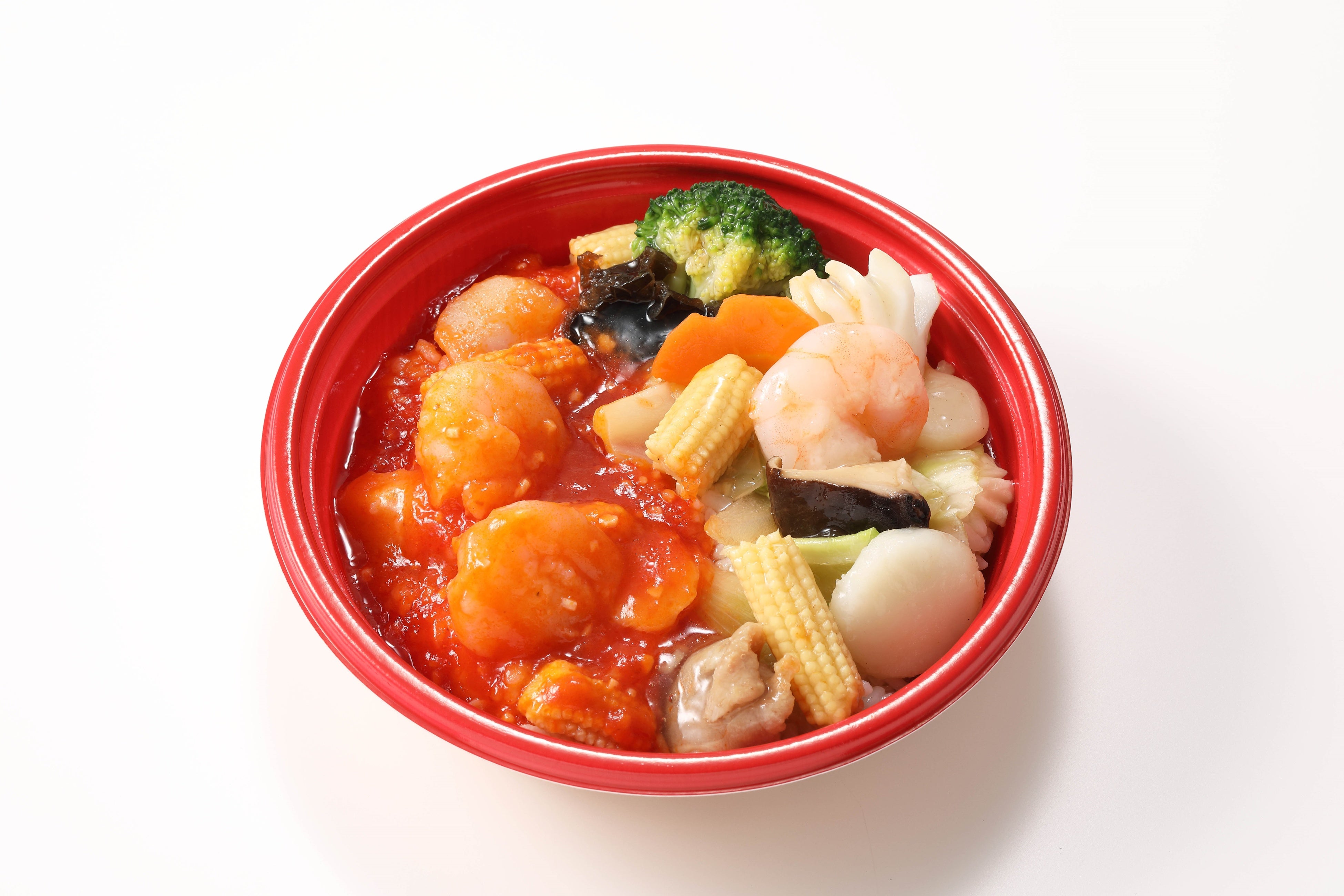 人気の惣菜、エビチリと八宝菜が一度に味わえる贅沢丼です。