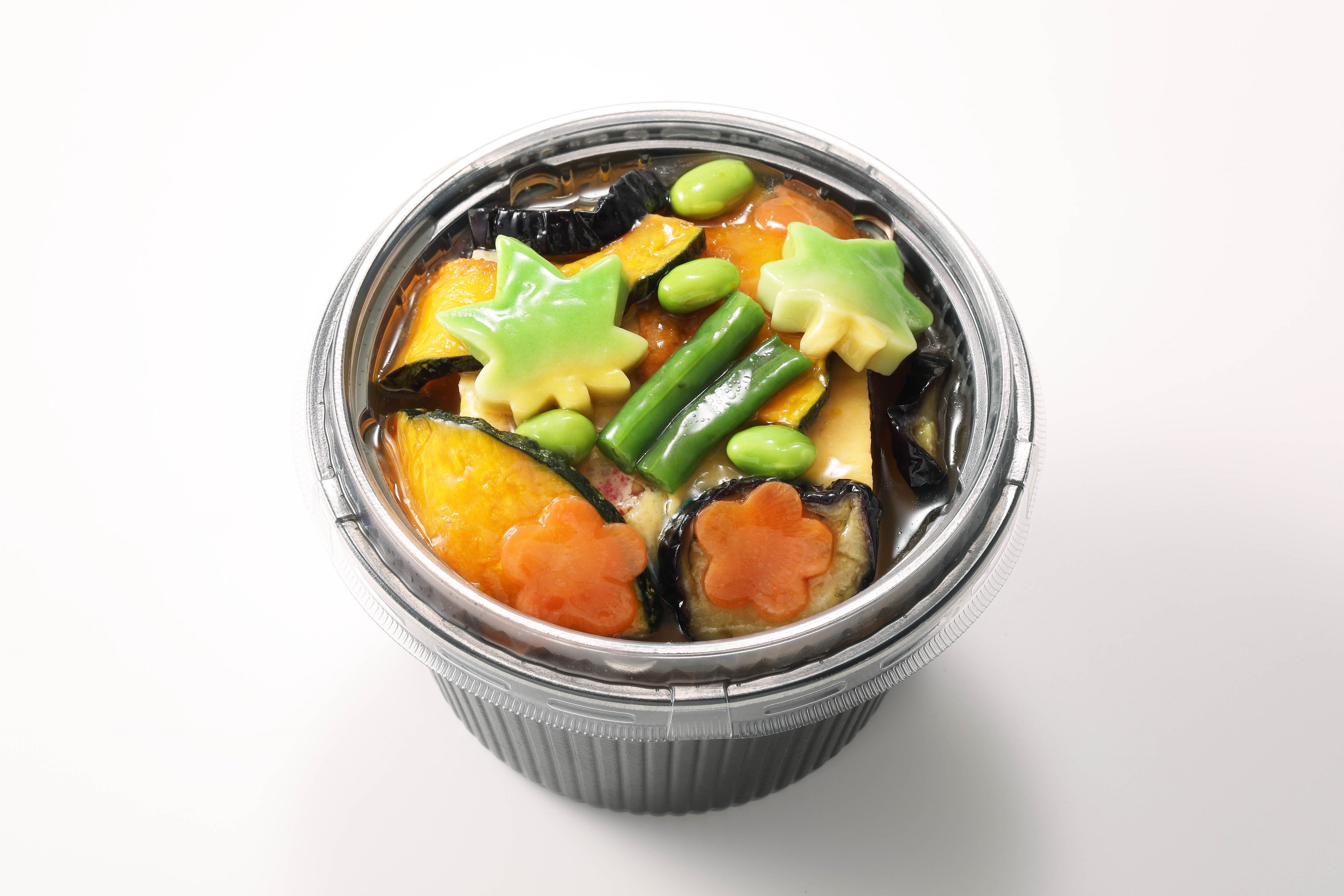 2種類のだし巻に夏野菜を添え、たっぷりのお出しあんをかけました。