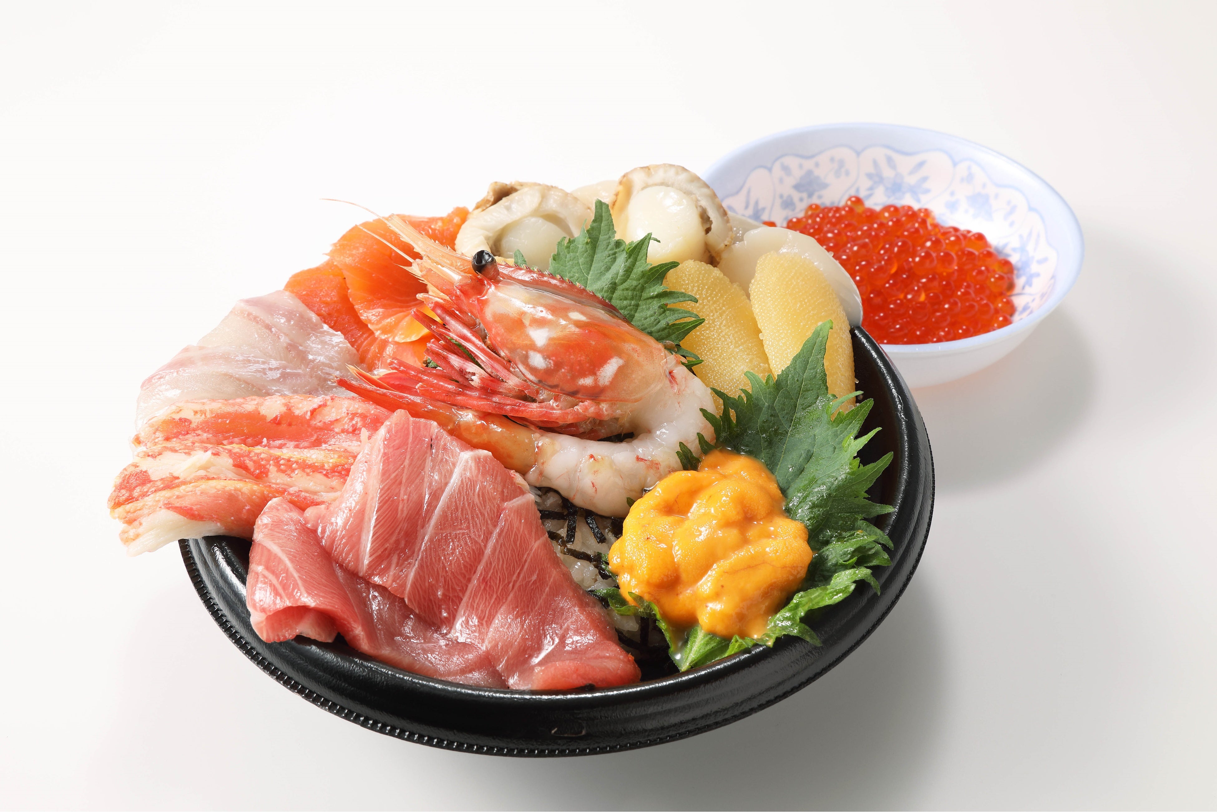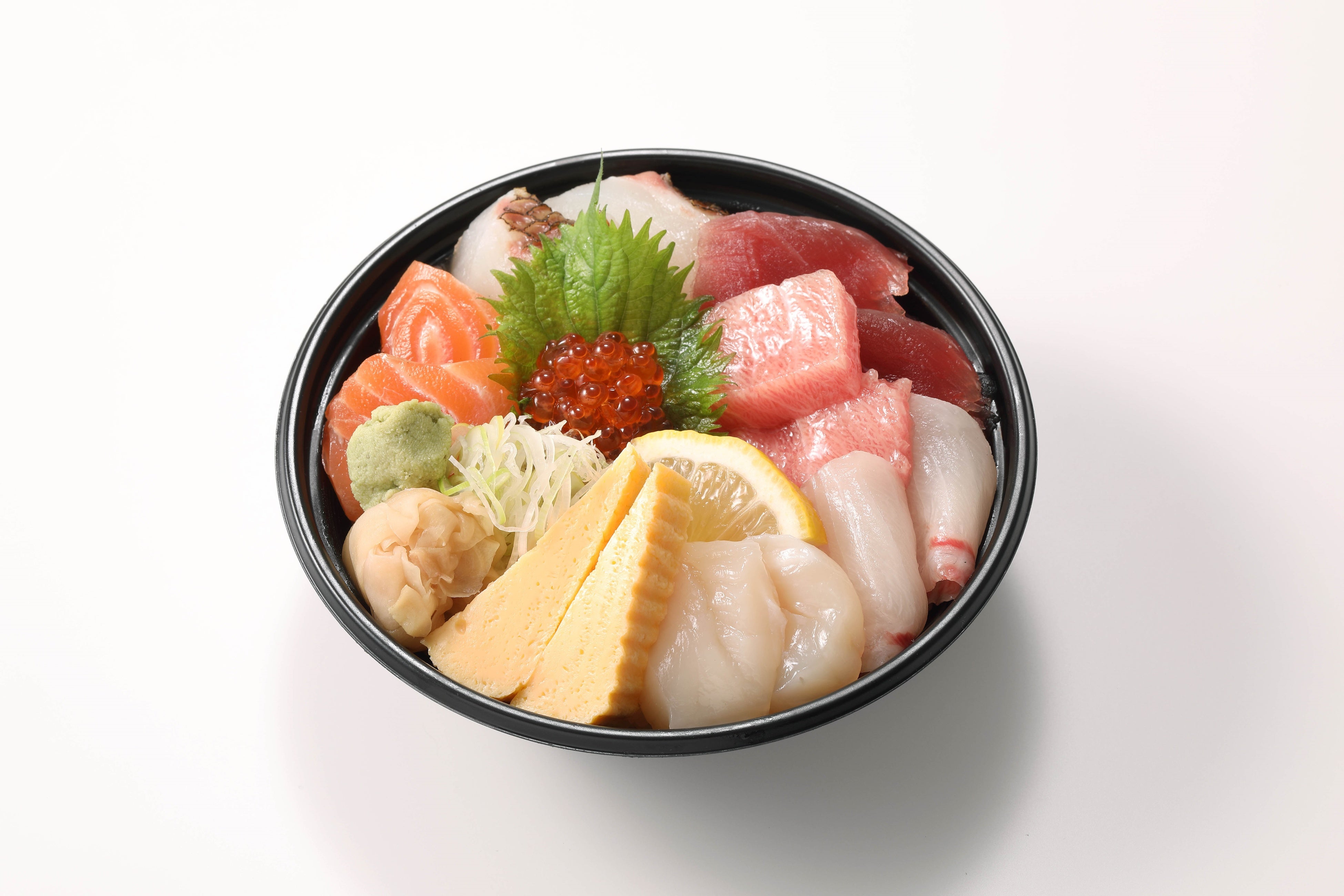 サーモン、たい、まぐろ、穴子、えび、いくら、ほたての7種が入ったどんぶり。