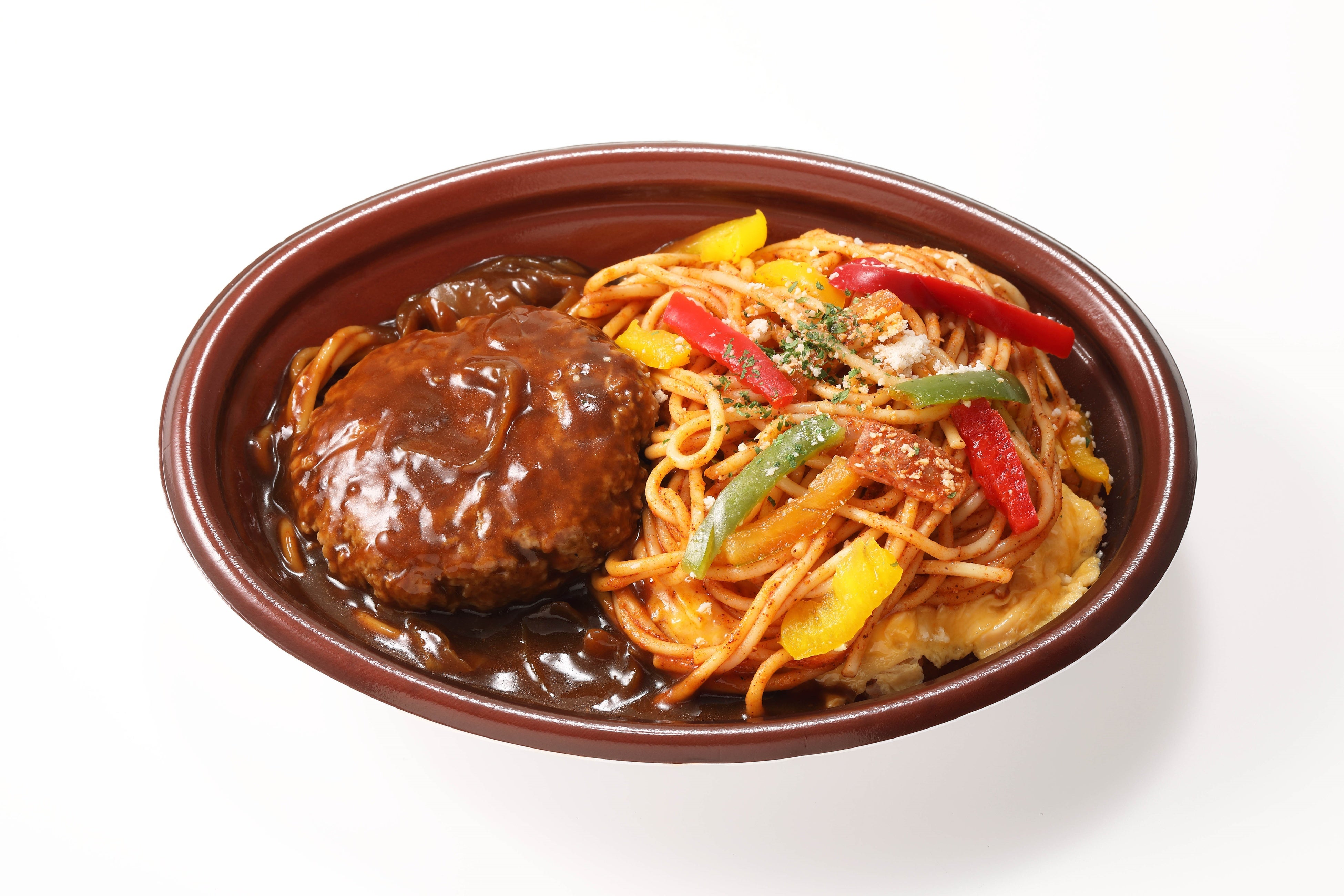 大きなハンバーグとスパイシーナポリタンをトッピングしたボリューミーなオムライス丼。