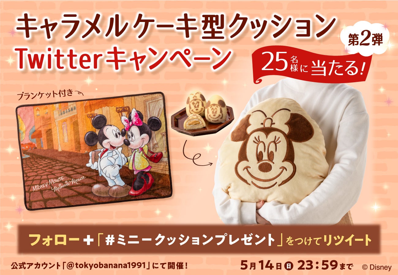 東京ばな奈とディズニーが一緒に作りあげた初の共同スイーツショップ「Disney SWEETS COLLECTION by 東京ばな奈」。話題作『ミッキーマウス&ミニーマウス/「銀座のキャラメルケーキ」です。』の大好評を記念した、オリジナルブランケット付きクッション(非売品)を抽選で25名様にプレゼントするTwitter キャンペーンを開催しております!(https://twitter.com/tokyobanana1991/status/1655376975186513920?s=20)