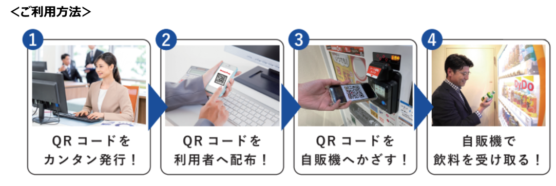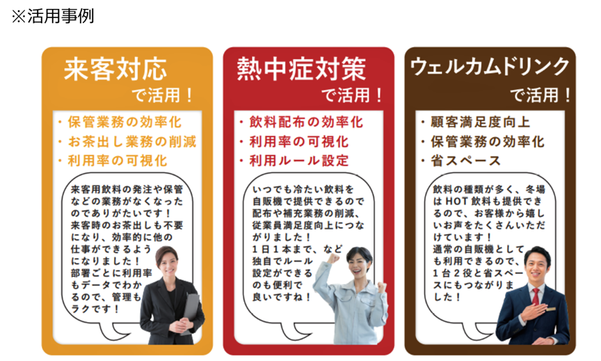 本サービスにより、例えばオフィスや工場といった施設管理者が従業員に対し福利厚生として1日1本の飲料を提供することで熱中症対策として水分補給を促進するきっかけとなったり、来客対応の際の業務の効率化につながるなど、様々な場面で便利に、有効にご活用いただけるものと期待しております。