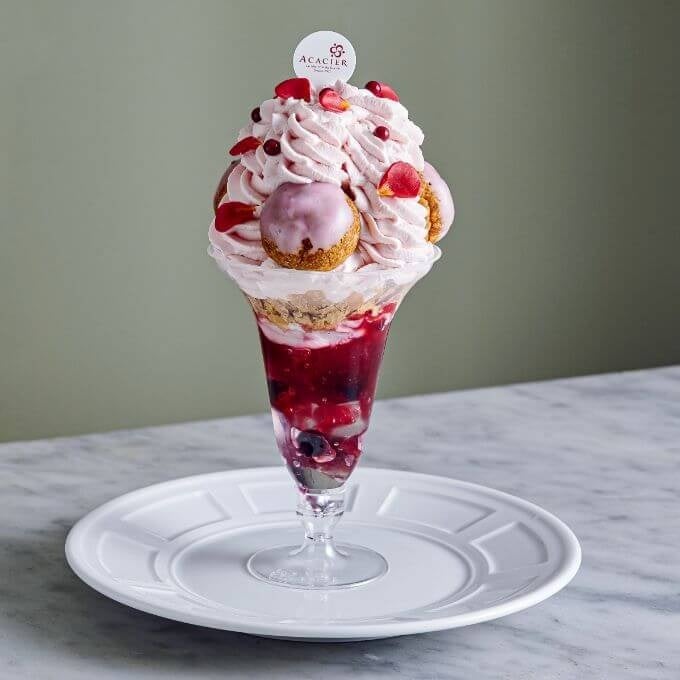 2007年の創業以来、フランスの伝統菓子をベースにした洋菓子で愛される浦和の人気店。日本の産地へ赴いて出会った旬のフルーツや、地元・埼玉県産の素材を活かしたスイーツも手掛けています。バラの香りをベースにしたアイスクリームやシャンティ・クリーム、ジュレ、ベリーのソルベやソースなど、多彩な味わいのハーモニーに感動。<ACACIER(アカシエ)>のスペシャリテである「アントワネット」をパフェ仕立てに。