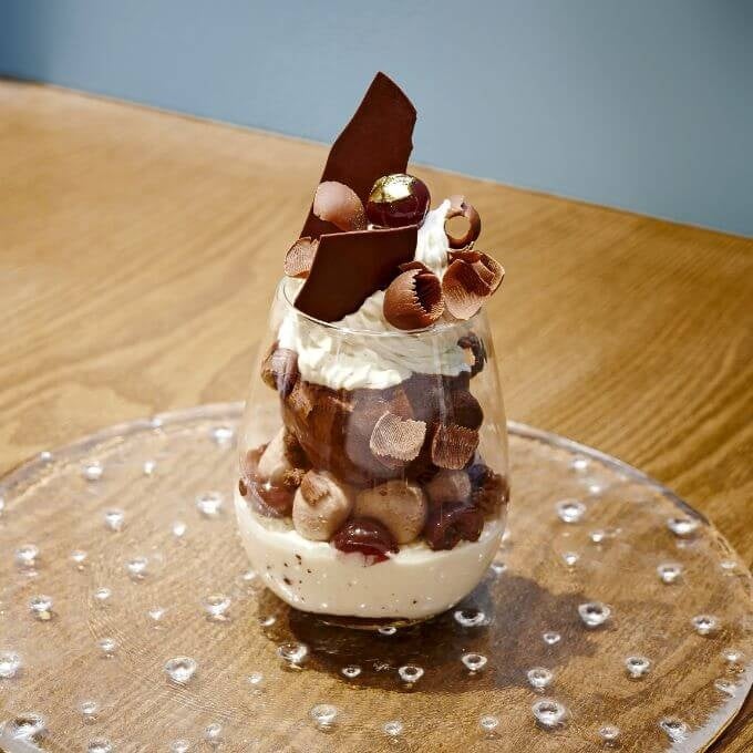 鎌倉駅西口から徒歩2分にある、ガストロノミーの世界のアシェットデセールを味わえるレストラン<Régalez-Vous (レガレヴ)>。フランス・ヨーロッパを代表するお菓子Forêt Noire(黒い森)をパフェにしました。アーモンド香るリッチなチョコレートのビスキュイにグリオットチェリー・ホワイトチョコレートのクリームをたっぷり入れ、ミルクチョコレートのガナッシュモンテとすっきりしたビターチョコレートのソルベとバニラクリームにチョコレートの飾りで仕上げています。