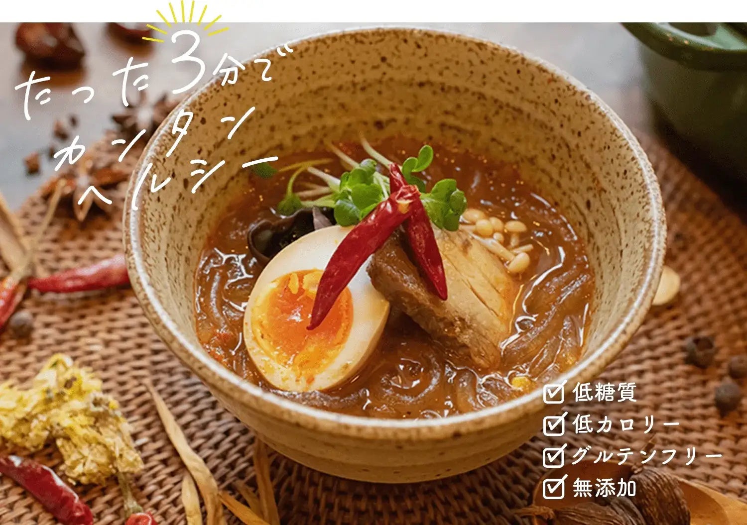 ピリ辛マーラータンは飲み干しても1杯192kcalで、低糖質、低脂質、無添加、グルテンフリーです。