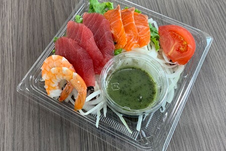 ベース部分にスライス玉ねぎ、リーフレタス、くし切りトマトをあわせ、店舗の水産部門で鮮魚をのせることで簡単にカルパッチョが完成します。ソースはバジルの華やかな香りとパルメザンチーズの深みが特長のケンコーマヨネーズ製『イタリアンバジルソース(https://www.kenkomayo.com/pro/g/g15304/)』です。