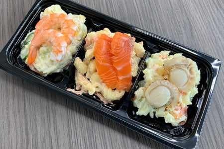 ベース部分は、北海道産じゃがいも“とうや”を使用した2種類のポテトサラダと明太子マカロニサラダです。店舗の水産部門で海老、サーモン、ほたてをトッピングするだけで商品が完成します。