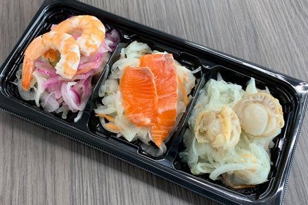 ベース部分は玉ねぎやにんじん、紫玉ねぎ、きゅうりを使用し、レモン果汁の風味をきかせたさっぱりとしたマリネです。店舗の水産部門で海老、サーモン、ほたてをトッピングするだけで商品が完成します。