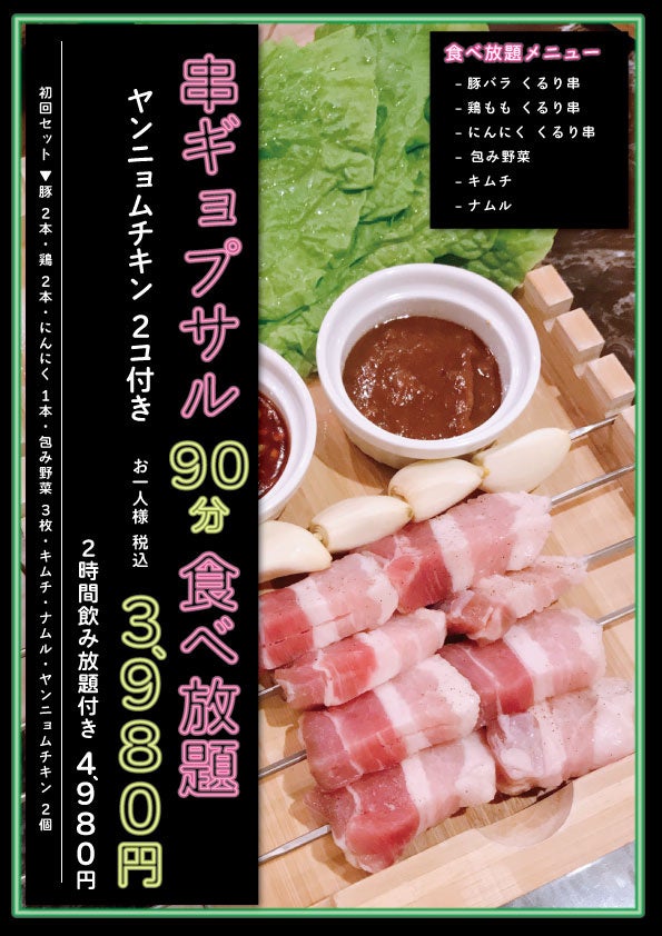 この度、5月9日(火)より期間限定で、若い女性に人気の韓国グルメをとり入れた「串ギョプサル90分食べ放題」をお一人様3,980円(税込)で提供開始いたします。豚バラ串(串ギョプサル)、鶏もも串、にんにく串、サンチュなどの包み野菜、キムチ、ナムル、ピリ辛 味噌ソース、30種類以上の各種スパイスの全てが食べ放題です。さらに、プラス1,000円(税込)で、2時間飲み放題もお楽しみいただけます。初回セットには、ヤンニョムチキン2個をサービスいたします。串ギョプサルが食べ放題で楽しめるのは今だけです。