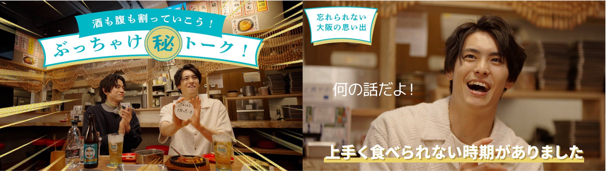 記念すべき第一回は、「サントリー ビアボール応援副団長」を務める高野さんがゲストとして登場!二人きりでの食事は初めてという二人が、大阪梅田にある居酒屋「串かつ酒場 ジェット」に遠征。高橋さんお手製の「ビアボール」を飲みながら、創作串カツやお好み焼きなどの大阪グルメをたっぷり堪能してもらいました。
