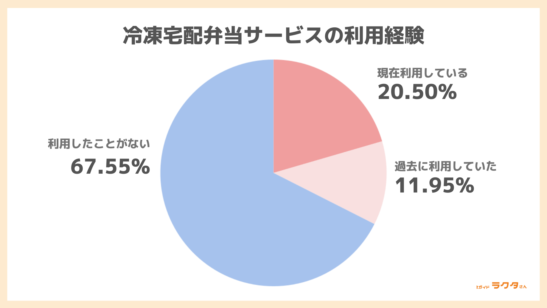 冷凍宅配弁当サービスを利用したことがあるかを尋ねたところ、「現在利用している」が20.50%、「過去に利用していた」が11.95%。約3割は利用経験がありました。