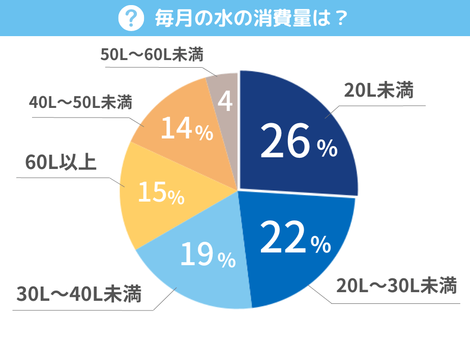 毎月の水の消費量は20L未満が最多で26%。一方、60L以上は全体の15%