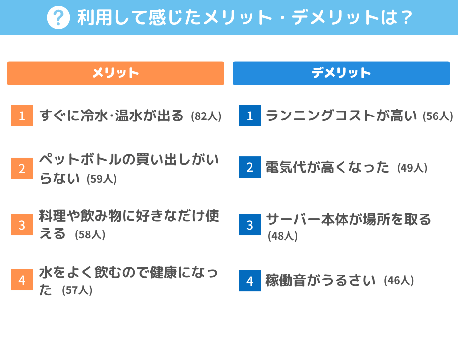 メリットは「すぐに冷水・温水がでる」が1位。デメリットは「ランニングコストが高い」が1位。