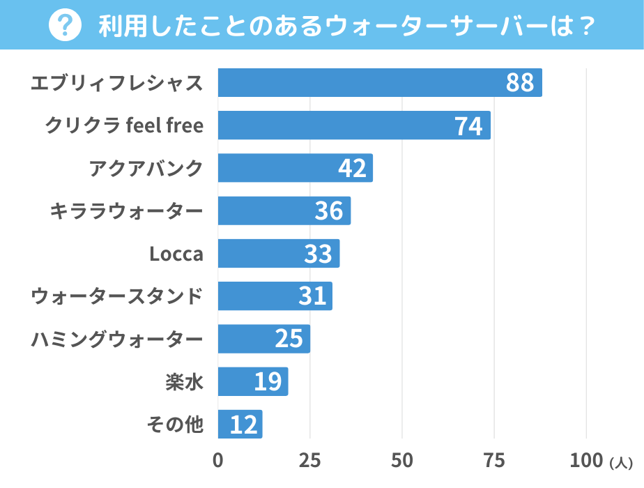 「利用したことのあるウォーターサーバーを教えてください」という設問に対しての回答は、「エブリィフレシャス」が最も多く、回答者は200人中88人でした。次いで「クリクラ feel free」が74人、「アクアバンク」が42人と続きます。エブリィフレシャスは、おしゃれなデザインやランニングコスト、高い機能性が人気で選ぶ人が多いようです。