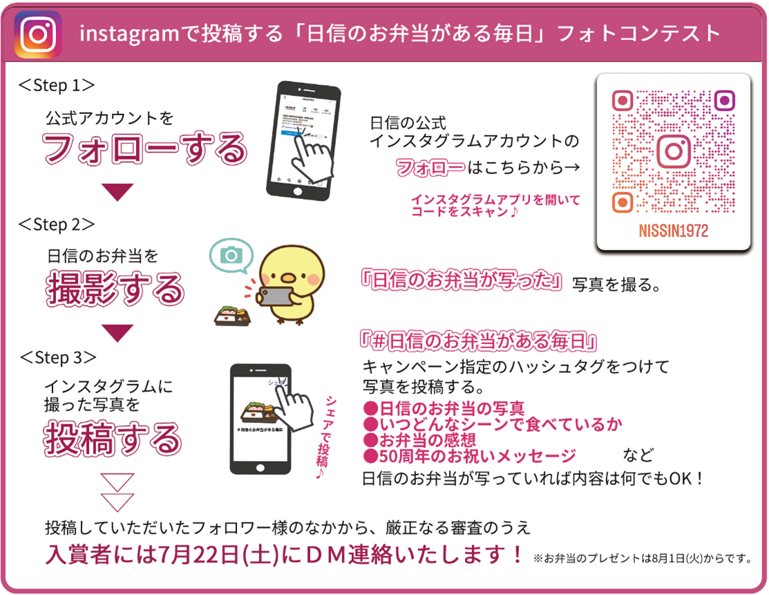 今回の創業50周年感謝キャンペーンでは2つのキャンペーンで総額100万円以上の還元を予定しております。「毎週1,000名様に当たる!LINE抽選クーポンキャンペーン」では、LINE会員様のうちキャンペーン期間中最大8,000名様に抽選で100円OFFクーポンを配布予定です。また、「Instagramで投稿する、“日信のお弁当がある毎日”フォトコンテスト」では、日信のお弁当の画像とコメントを投稿していただいたフォロワー様のなかから、厳選なる審査のうえ最優秀者1名様、優秀者5名様、入選50名様の計56名様を選出し、最優秀者1年分、優秀賞半年分、入選3ヶ月分の日信のお弁当をプレゼントさせていただきます。