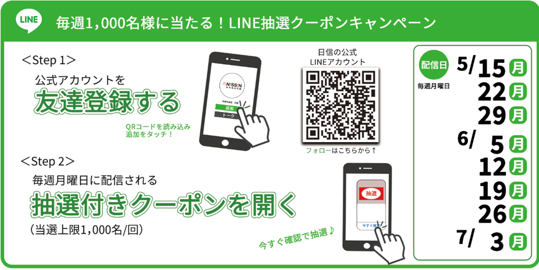 <抽選方法>期間中毎週月曜日に抽選付クーポンをLINE会員様に配信