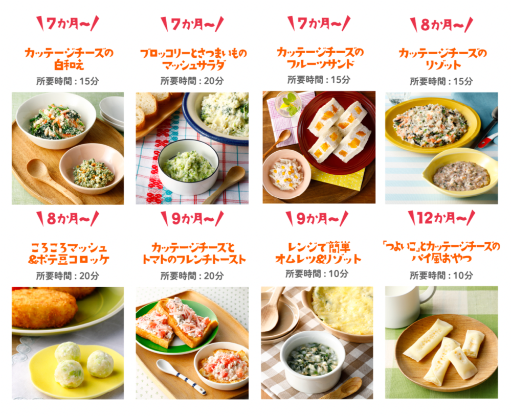 離乳食中期にあたる7~8か月頃になると、離乳食の食材にカッテージチーズが使えるようになります。カッテージチーズはクセが無く、様々な食材と混ぜて使いやすいので離乳食にぴったりです。