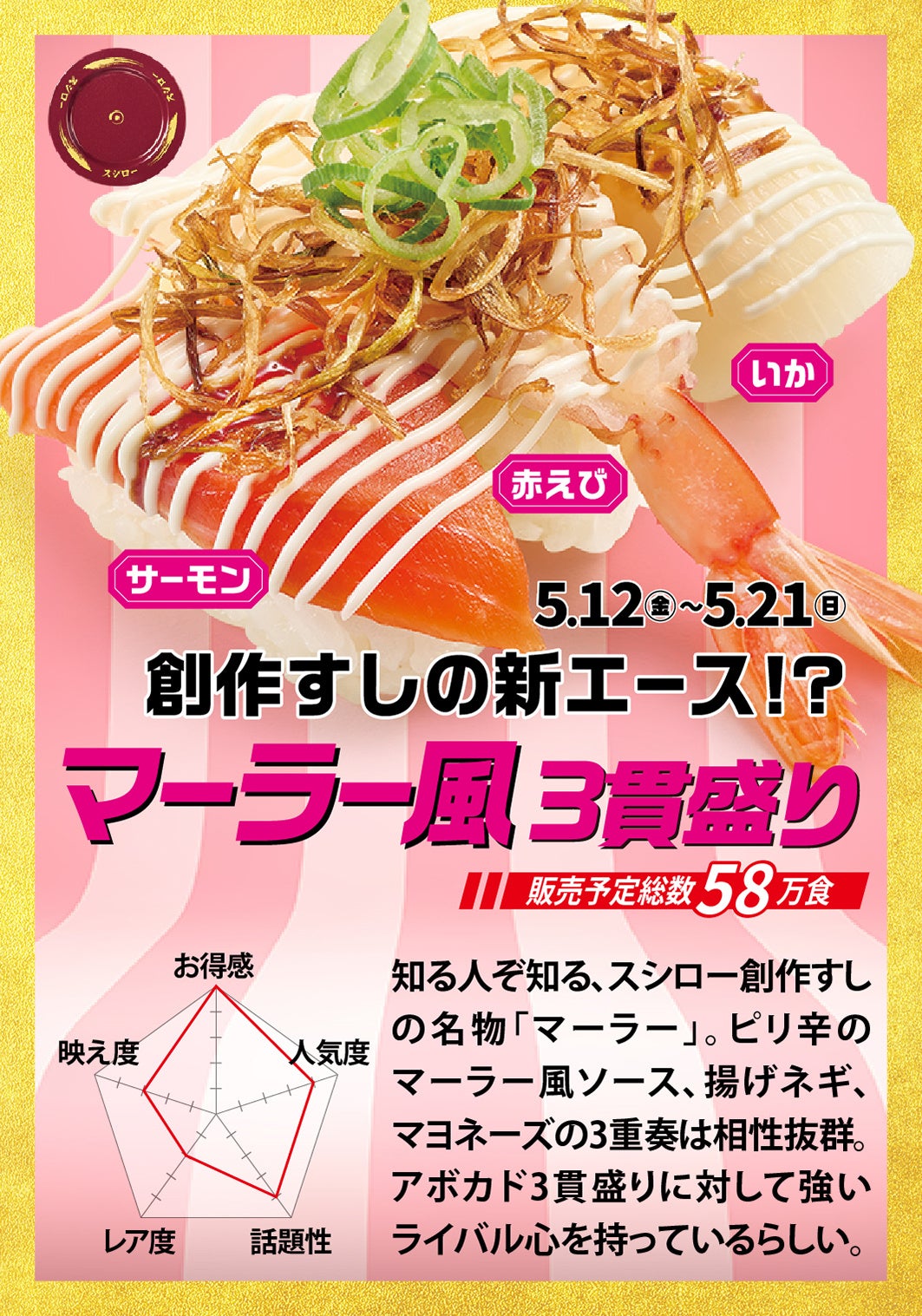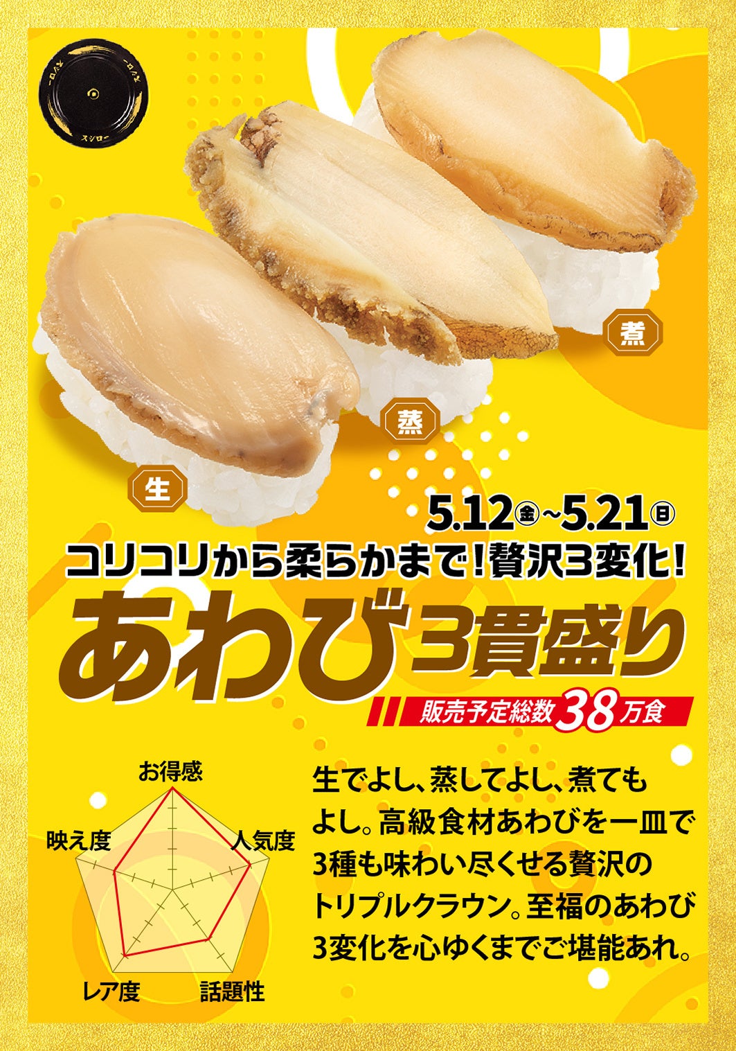 ほかにも、高級食材のあわびを生、蒸、煮の3種類で食べ比べができる「あわび3貫盛り」や、販売する度に大好評の「マーラー風味赤えび揚げネギ添え」に、サーモンといかを合わせた、「マーラー風3貫盛り」が登場します。「マーラー風3貫盛り」は、赤えびはもちろん、人気のサーモンや、甘みや旨みを感じられるいかに、ピリ辛の中華風特製マーラーソース、揚げネギ、特製マヨネーズをトッピングしました。