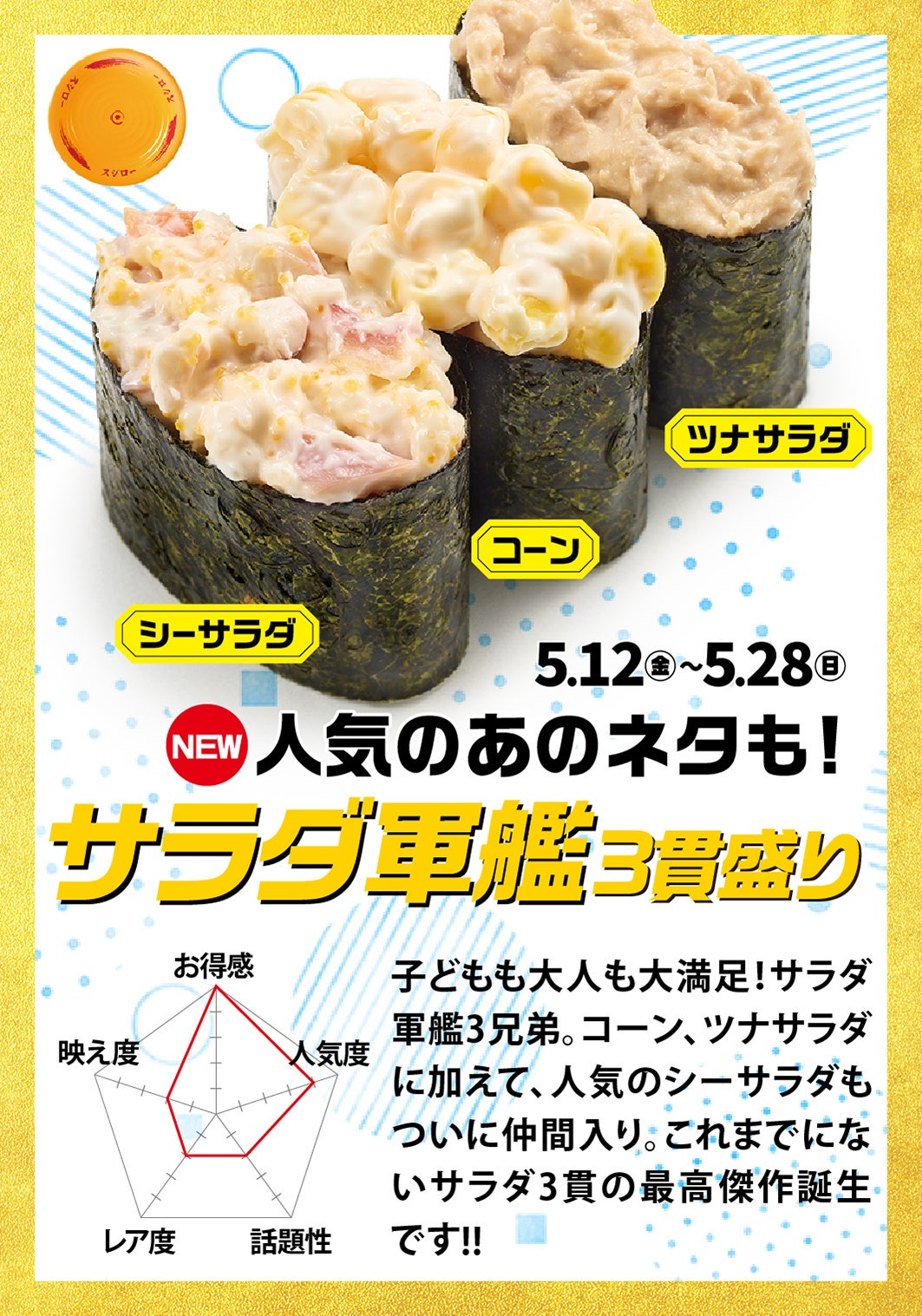 今回新しくなった「真いか3貫盛り」は、真いかを、“生”、“炙り松笠”、“卵黄醤油和え山わさびのせ”と、食べ比べができます。一番お手頃な黄皿で登場する、いか好きには堪らない一皿です。そして、「サラダ軍艦3貫盛り」も組み合わせが変わります。しっかりとツナの食感を感じていただけるように、あえて粒感を感じるような加工をした“ツナサラダ”、甘みが強いスーパースイートコーンを店舗で塩茹でしてから、特製マヨネーズと和えている“コーン”と、いかやほっき貝のひも、くらげなどが入った食感が楽しい“シーサラダ”が一皿になって新たに登場します。