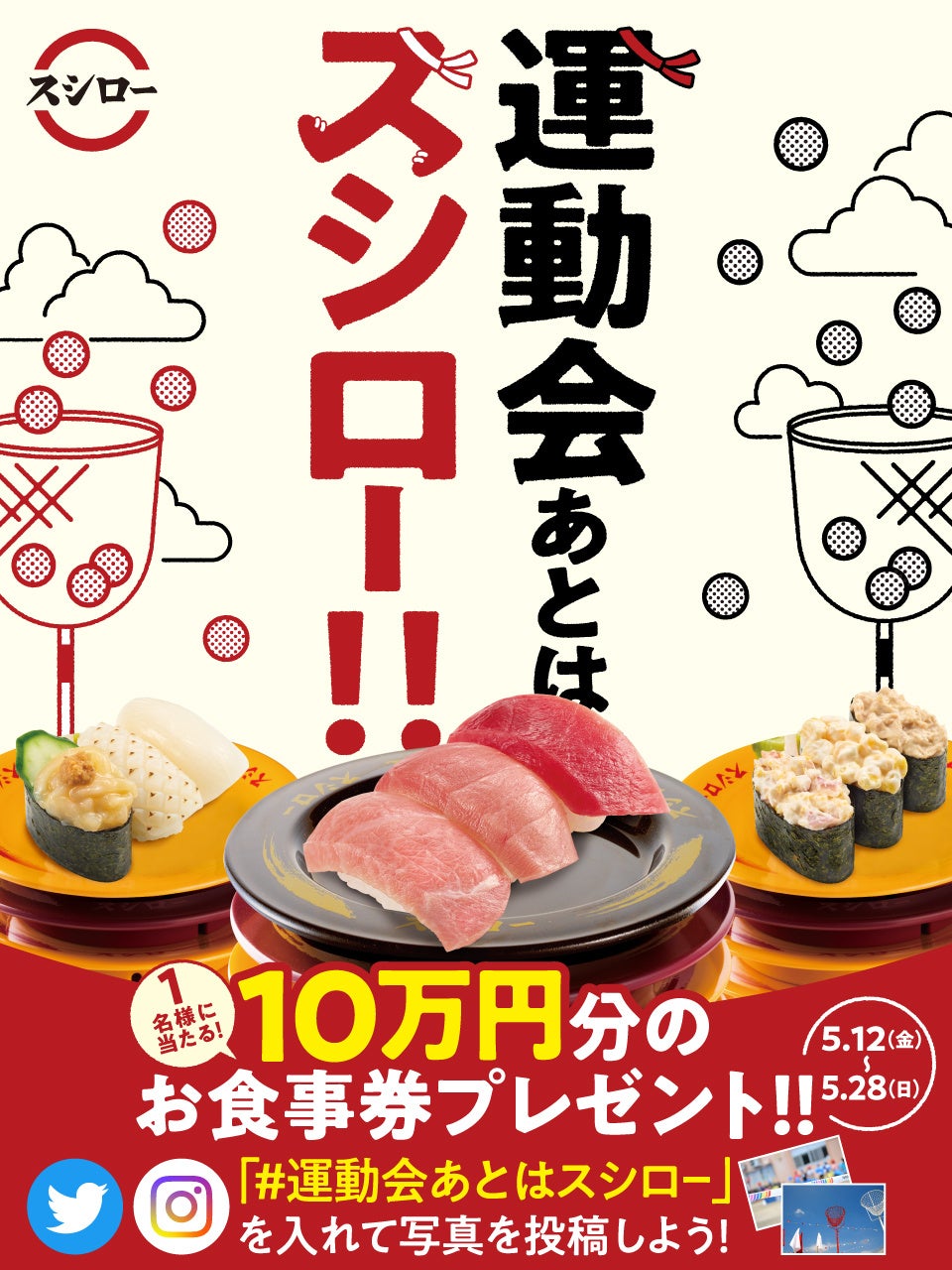 5月12日(金)より、スシローの公式SNS(Twitter・Instagram)をフォローして、「#運動会あとはスシロー」をつけて写真または動画を投稿すると、10万円分のお食事券が1名様に当たる、フォトキャンペーンを開催いたします。