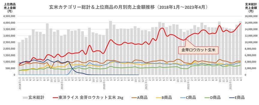 また、玄米カテゴリーにとどまらず、白米を含む米カテゴリー全体(約2900アイテム) では、売上数量ランキングで過去最高位として第5位を達成しています(※2)。