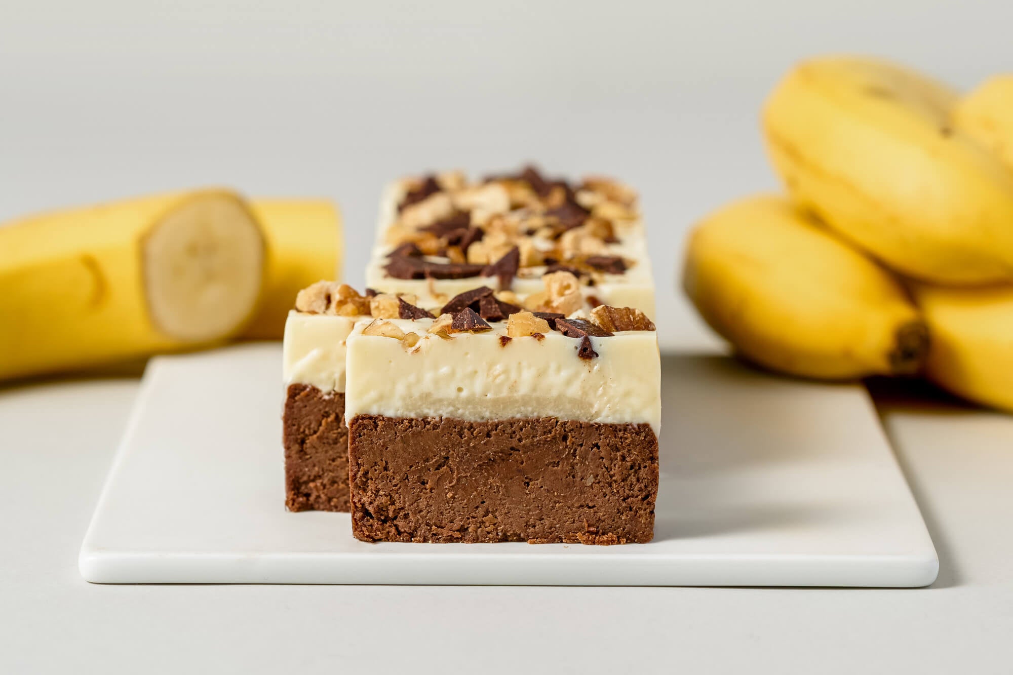 心地よい甘さの生ガトーショコラとミルキーなバナナカスタードクリーム、そしてクリーミーでほんのり酸味を感じる2種のチーズを使った”フロスティング”が織りなす至福の味わいをご堪能ください。仕上げにチョコレートチップと、塩とスパイスパウダーをまぶしてローストしたくるみを載せることで、食感と香りにアクセントを加えています。