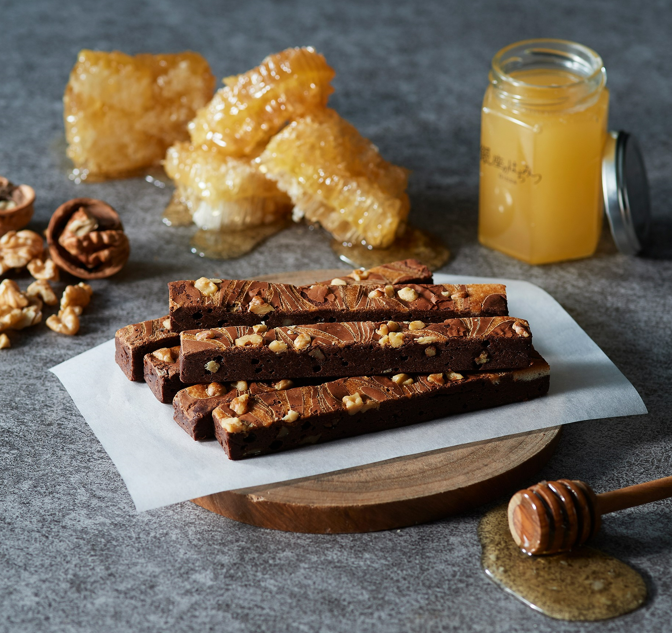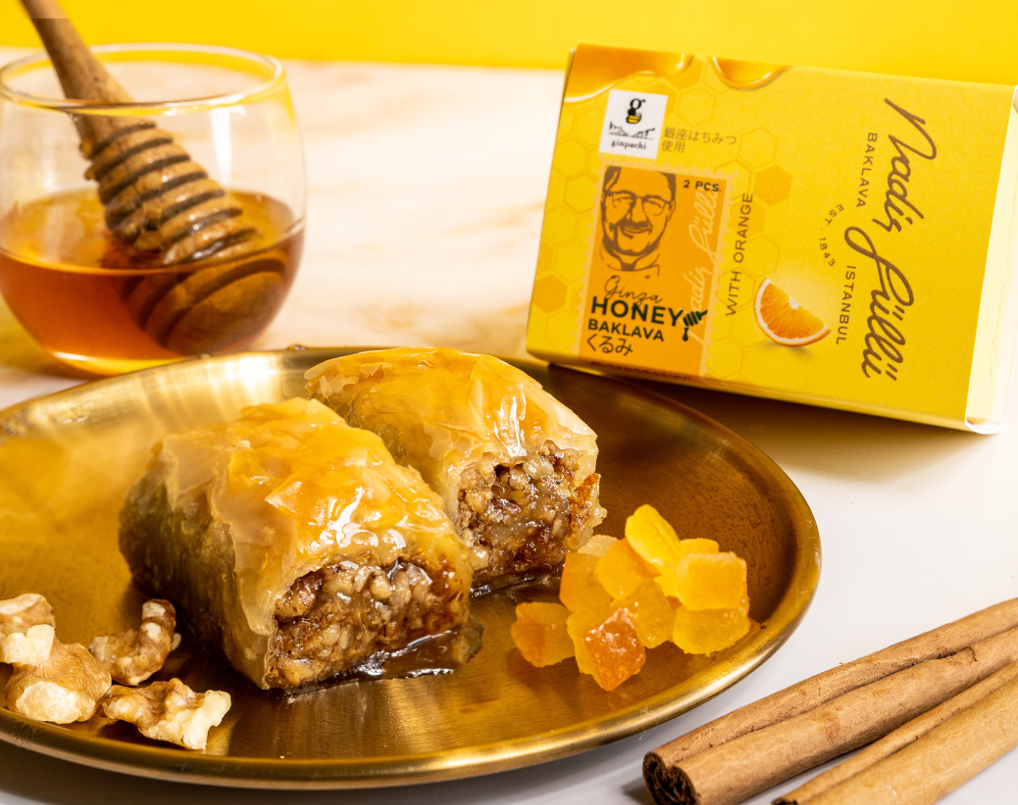 銀座はちみつと相性の良いくるみがたっぷり入ったロール型バクラヴァに、オレンジピールとシナモンを加え、奥行きのある味わい。
