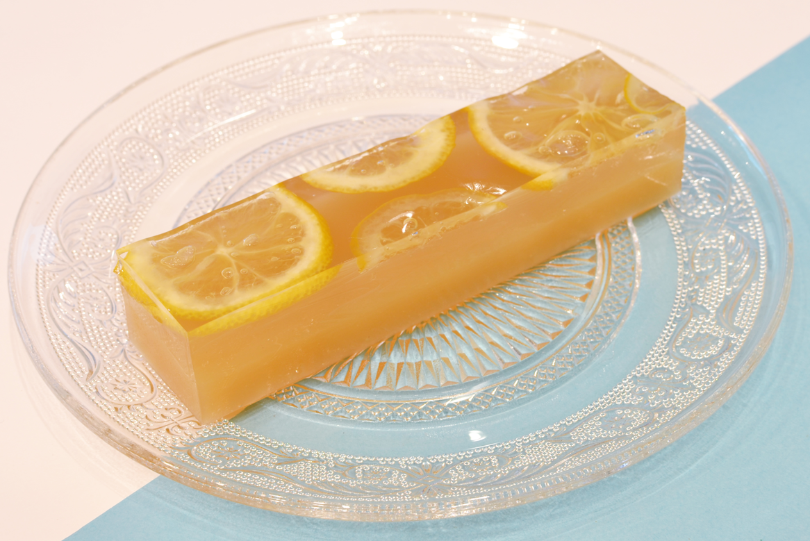 銀座はちみつを白餡に練り込んだ羊羹の上に瀬戸内レモンの蜜漬けをのせ、寒天で作った錦玉羹を合わせました。