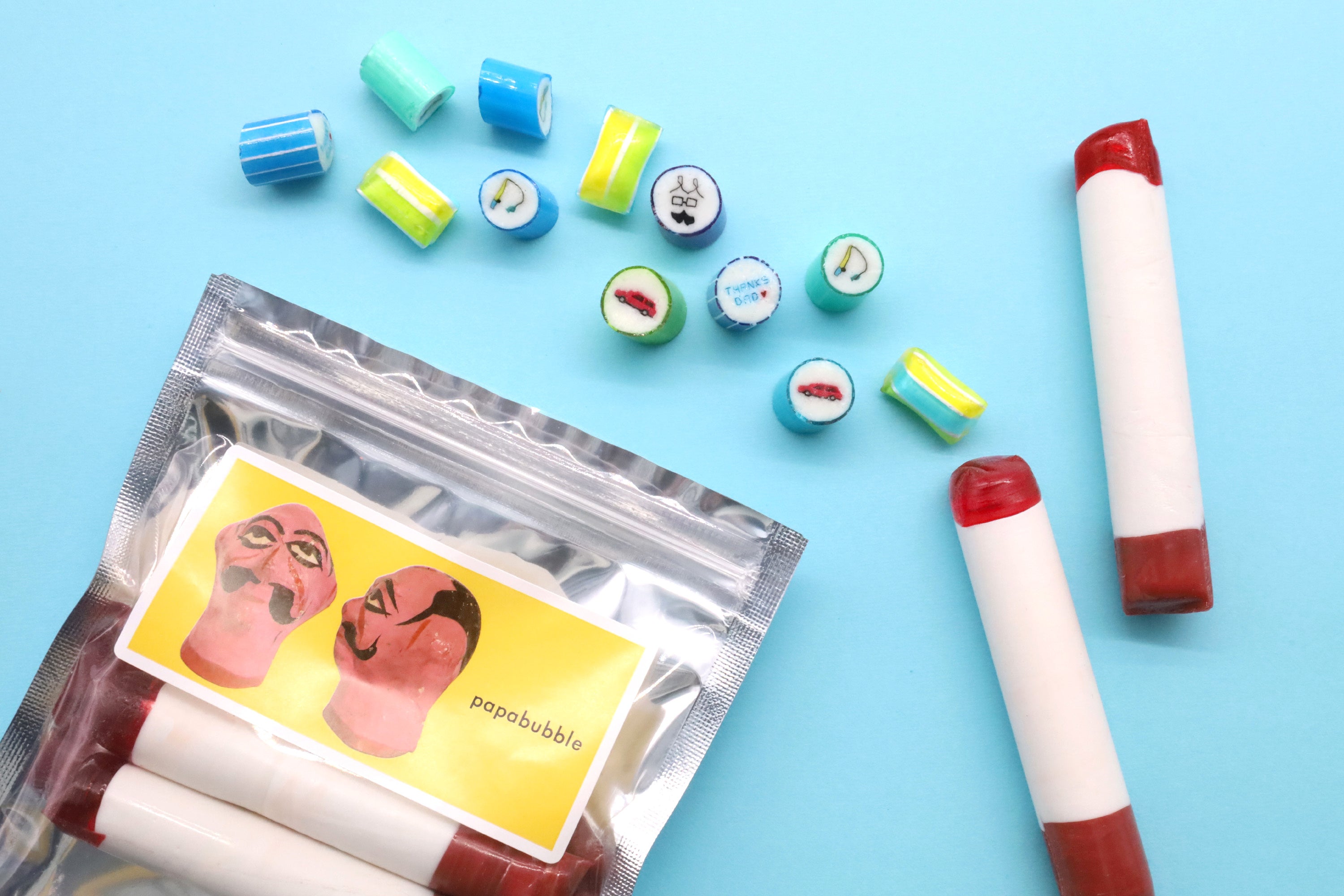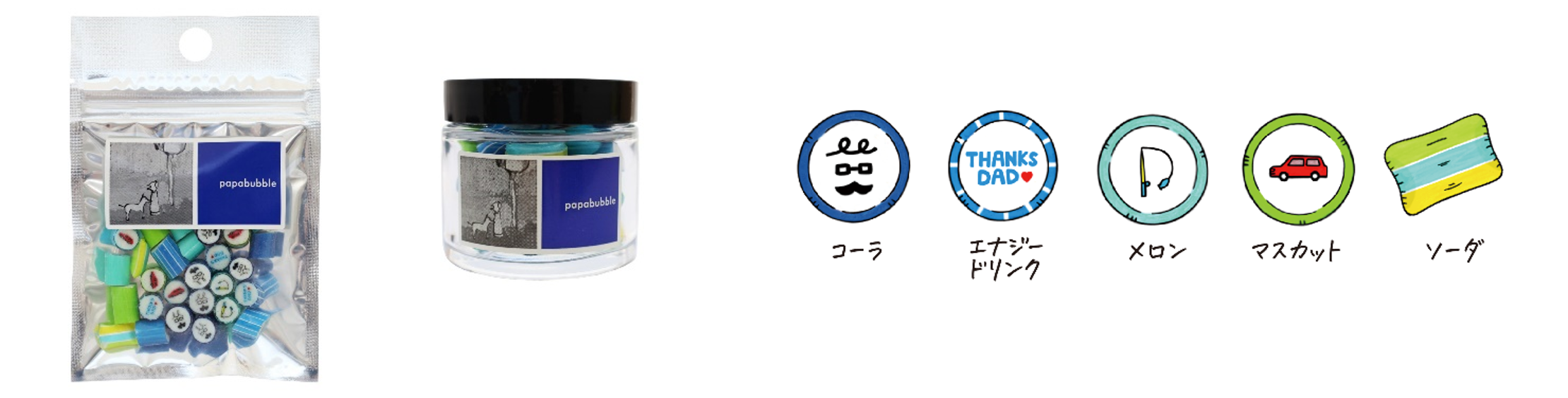 「いつもみんなの為に頑張っているお父さんが“ワクワク”するような、美味しくて楽しいギフトを」という想いのもと、釣りに行ったり、車をいじったりするのが好きなイメージのあるお父さんを想像して作ったのが「父の日ミックス」です。男性人気の高いドリンク系フレーバーと、少し暑くなってくる季節にぴったりのさっぱり系限定フルーツフレーバーであるメロンやマスカットをチョイスしました。ソーダとメロンを一緒に食べるとメロンソーダに、ソーダとマスカットでマスカットソーダになり、味の変化も楽しめます。パパブブレの職人技によって仕上げられた「TAHNKS DAD」の文字とハートに加えて、車の窓や魚はクリアになっており光にかざして楽しめるなど、遊び心を存分に取り入れたギフトキャンディとなっています。