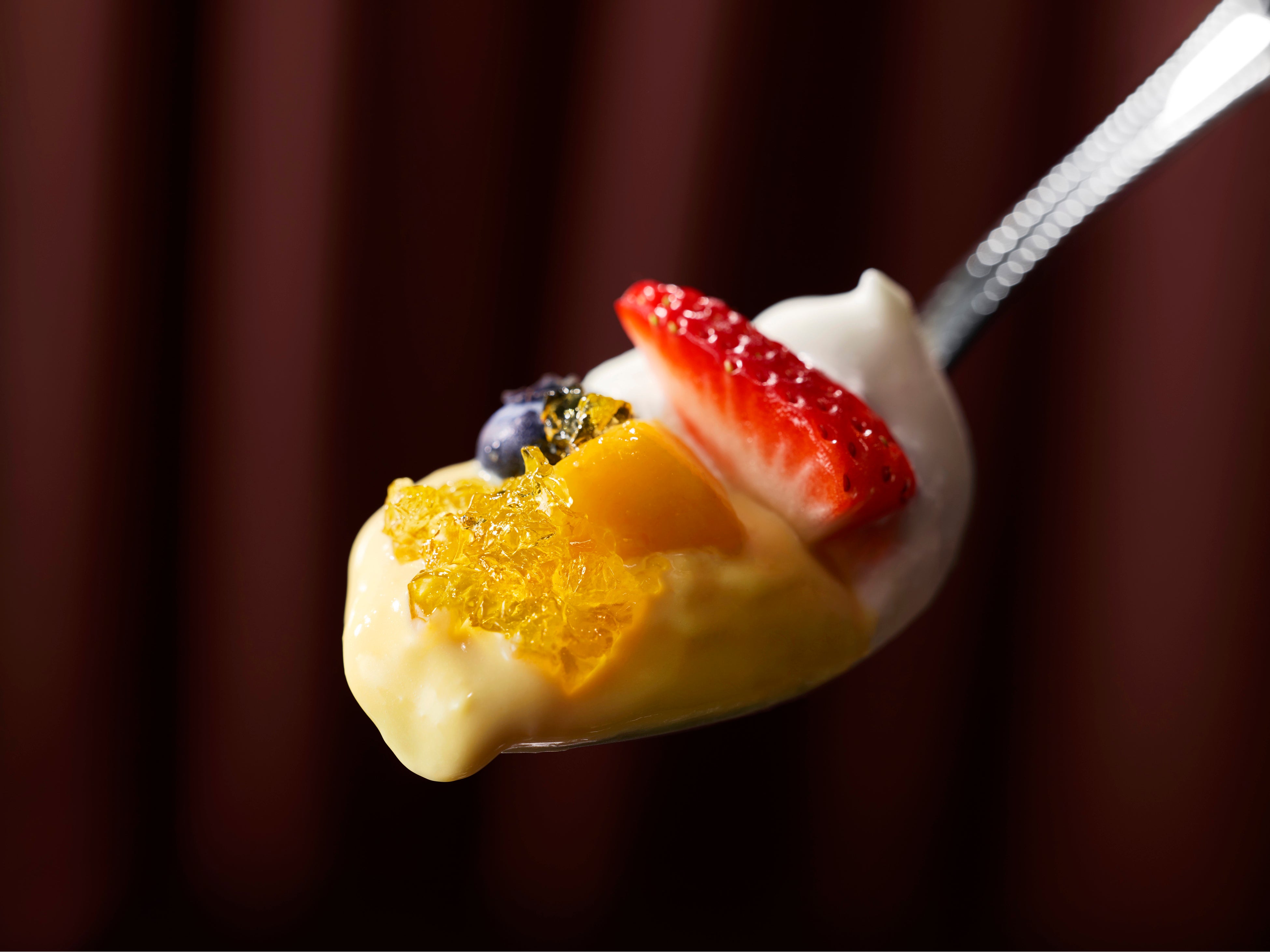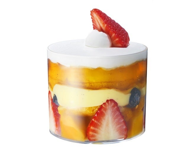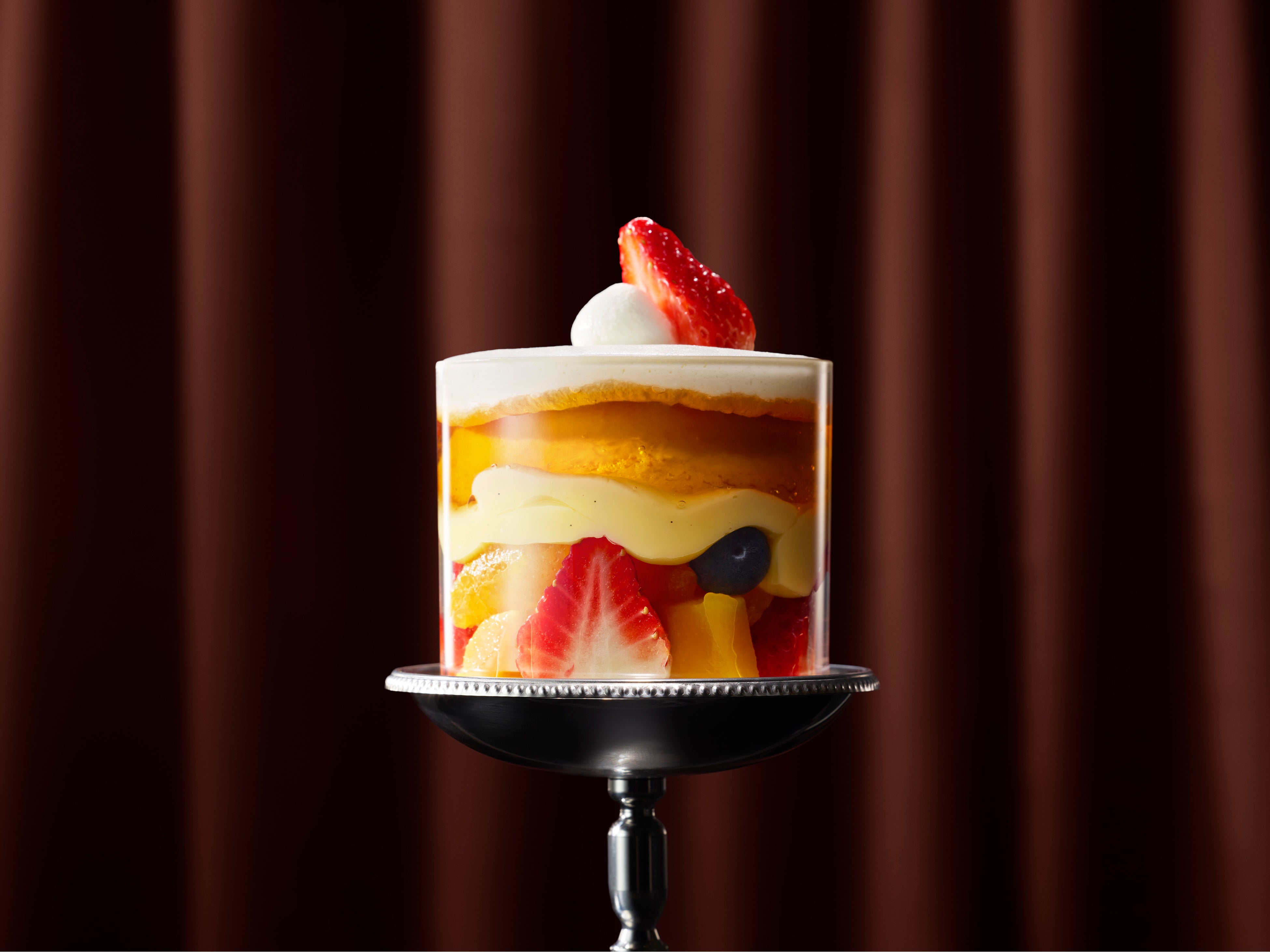 パステルのなめらかなプリンとフルーツとのマリアージュで、 最後の一口まで、わくわくするような“新しいおいしさ”をお楽しみいただきたい、そんな思いから生まれました。カラメルソースをゼリーで表現し、コクのあるディプロマットクリームなど、それぞれの素材を活かしたおいしい6層仕立てのスイーツです。下の方まですくって、大胆に混ぜてお召しあがりください。