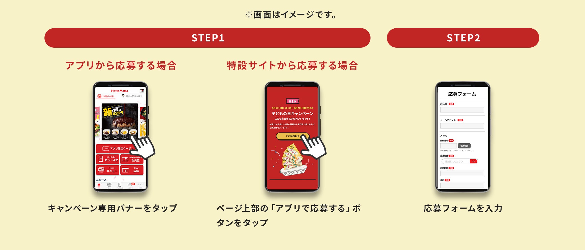 15周年スペシャルサイト、または「ほっともっと」公式アプリの専用バナーから各キャンペーンの応募フォームへリンク後、必要事項を入力し応募完了となります。