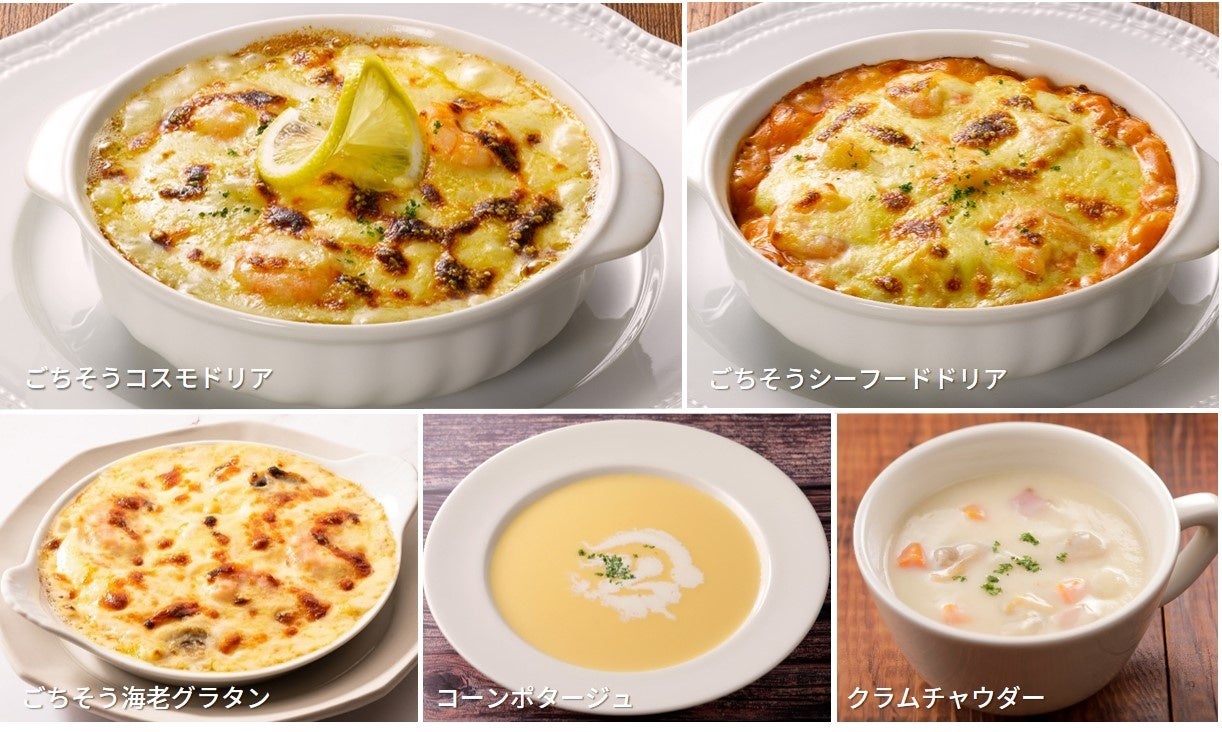 ・ごちそうコスモドリアx1・ごちそうシーフードドリアx1・ごちそう海老グラタンx2・コーンポタージュx2・クラムチャウダーx2