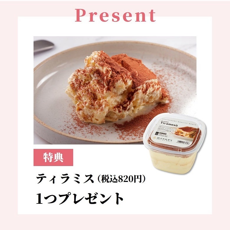 今回は、セット1つの購入に付き、ティラミスを1個プレゼントいたします。