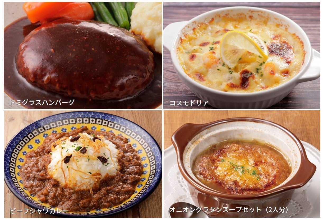 セット内容: ドミグラスハンバーグx2、ビーフジャワカレーx2、コスモドリアx2、オニオングラタンスープセット(2人分)x1