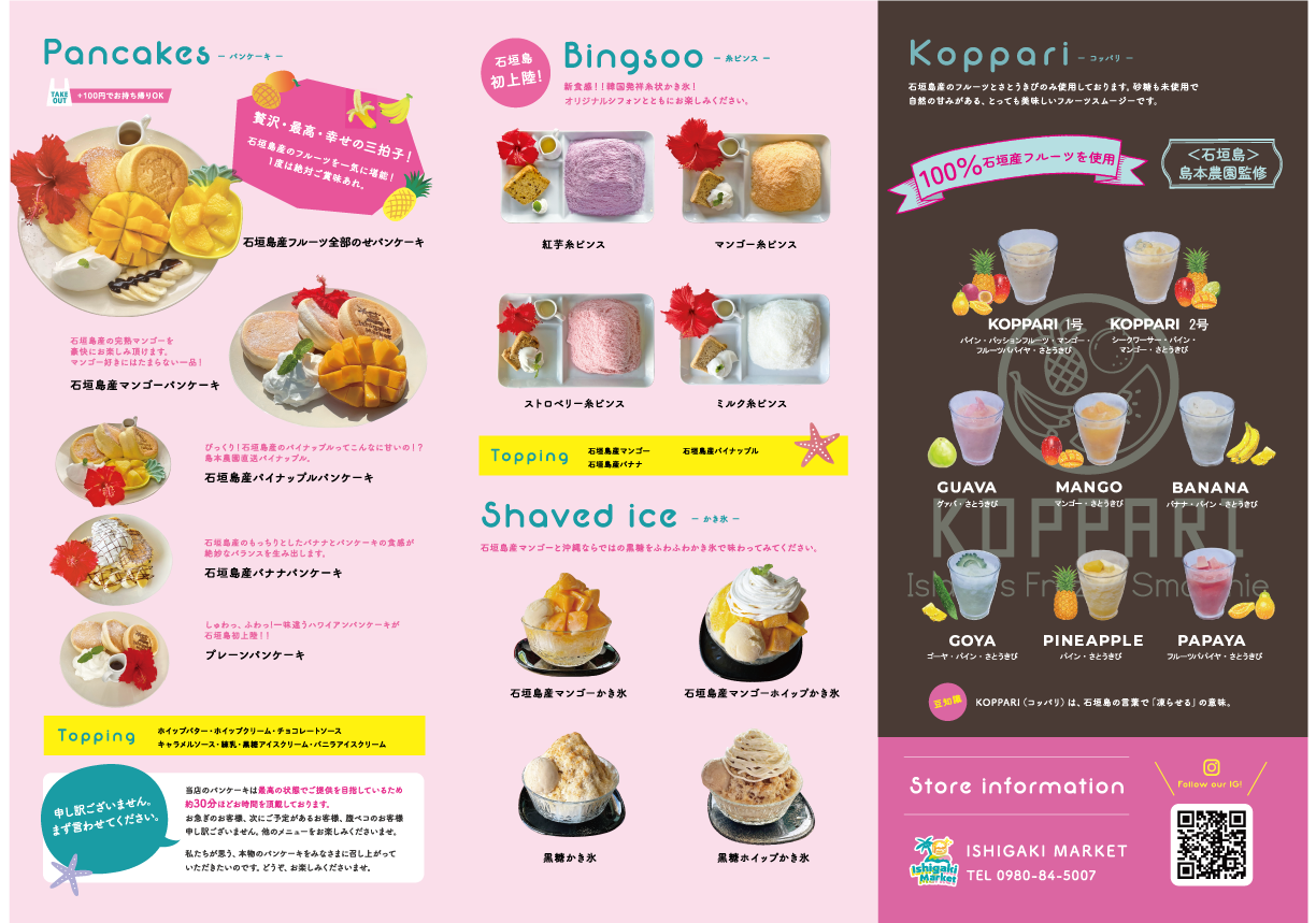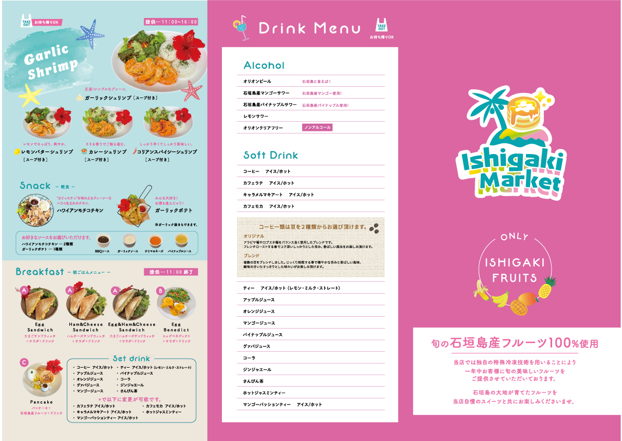 「ISHIGAKI MRKET」は2022年9月に沖縄県石垣市にオープンしました。代表者は石垣島が大好きでよく旅行に訪れており、その時に出会った方々とのご縁が重なって、長年の夢であった地でカフェをオープンするに至りました。石垣農家の全面協力を得て、パンケーキやスムージー等に使用するフルーツは全て石垣島で生産された最高品質のものを使用しております。またそのフルーツをより良い状態でお客様に提供するため、シーズンには生のもぎたてフルーツを、シーズンオフには旬の時期に収穫したフルーツを独自の特殊冷凍技術で品質維持したフルーツをパンケーキや他のスイーツと共にお楽しみいただけます。