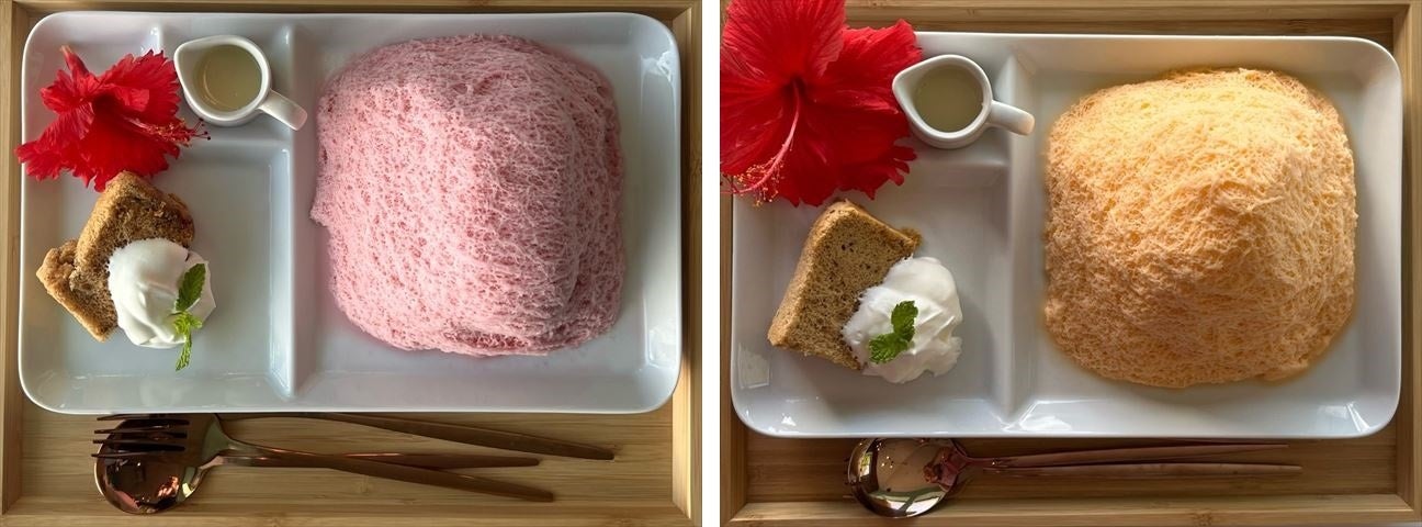 沖縄ならではのマンゴーや紅芋等、全4種類のオリジナル「糸ピンス」に相性の良いオリジナルケーキを添えてご用意しております。糸状に削り出した氷を何層にも重ねているので、スノーパウダーのように”ふわふわ”で一瞬で溶ける口どけの良さ、氷に味を染み込ませたことにより最後の一口まで変わらない美味しさをお楽しみいただけます。