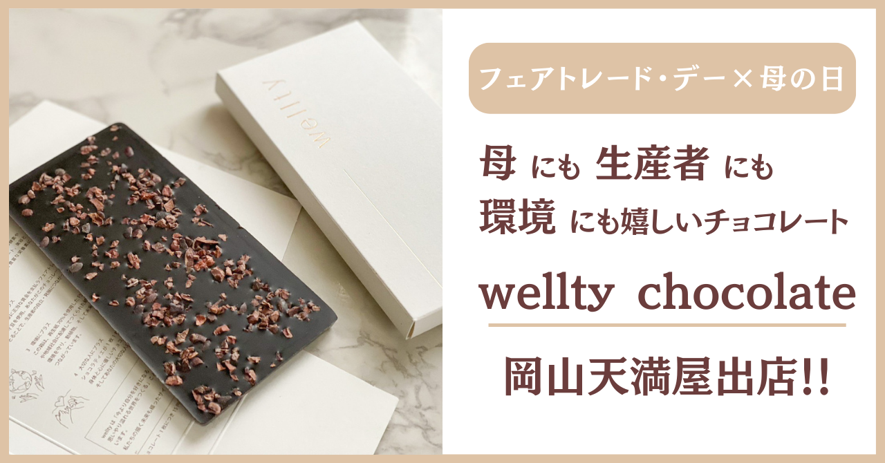 今年は、5月13日(土)が世界フェアトレード・デー。そして5月14日(日)は、母の日です。母の日のプレゼントに、母への感謝はもちろん、生産者や環境にも嬉しいチョコレートを、より多くの方に届けられるよう、このたび岡山天満屋で開催されるサステナブルイベント「いいものマルシェ」に出店することといたしました。