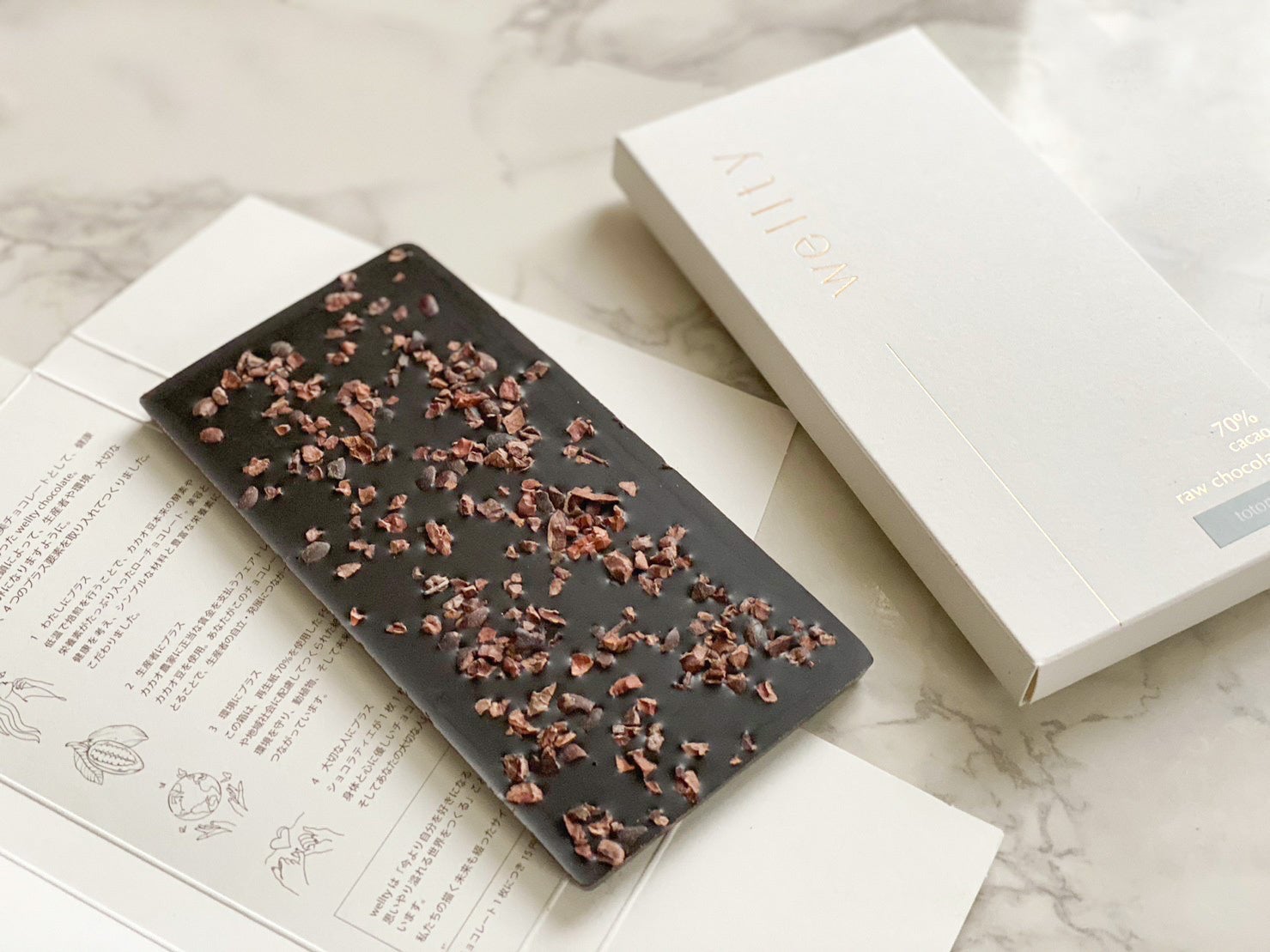 wellty chocolateは、カカオ豆に含まれるビタミンやミネラルなどの栄養や酵素が最大限含まれるよう、焙煎を必要最低限にしたローチョコレートです。乳化剤や香料、乳製品などを使用せず、甘味料に生はちみつまたはデーツシロップを使用することで、美と健康にプラスになるようなチョコレートに仕上げました。また、カカオ農家に正当な賃金を支払うフェアトレードのカカオ豆を使用したり、チョコレート1枚あたり15円を環境保護団体などに寄付したりと、手にとっていただくことによって人や社会、環境に配慮したサステナブルなチョコレートとなっております。