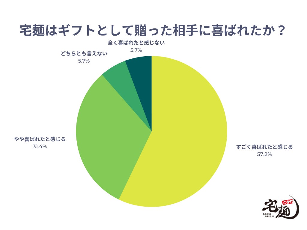 (3)で「ある」と回答したユーザーに対して、宅麺はギフトとして贈った相手に喜ばれたかを聞いたところ「すごく喜ばれたと感じる」(57.1%)、「やや喜ばれたと感じる」(31.4%)を合わせて、88.5%が「喜ばれたと感じる」と回答しました。