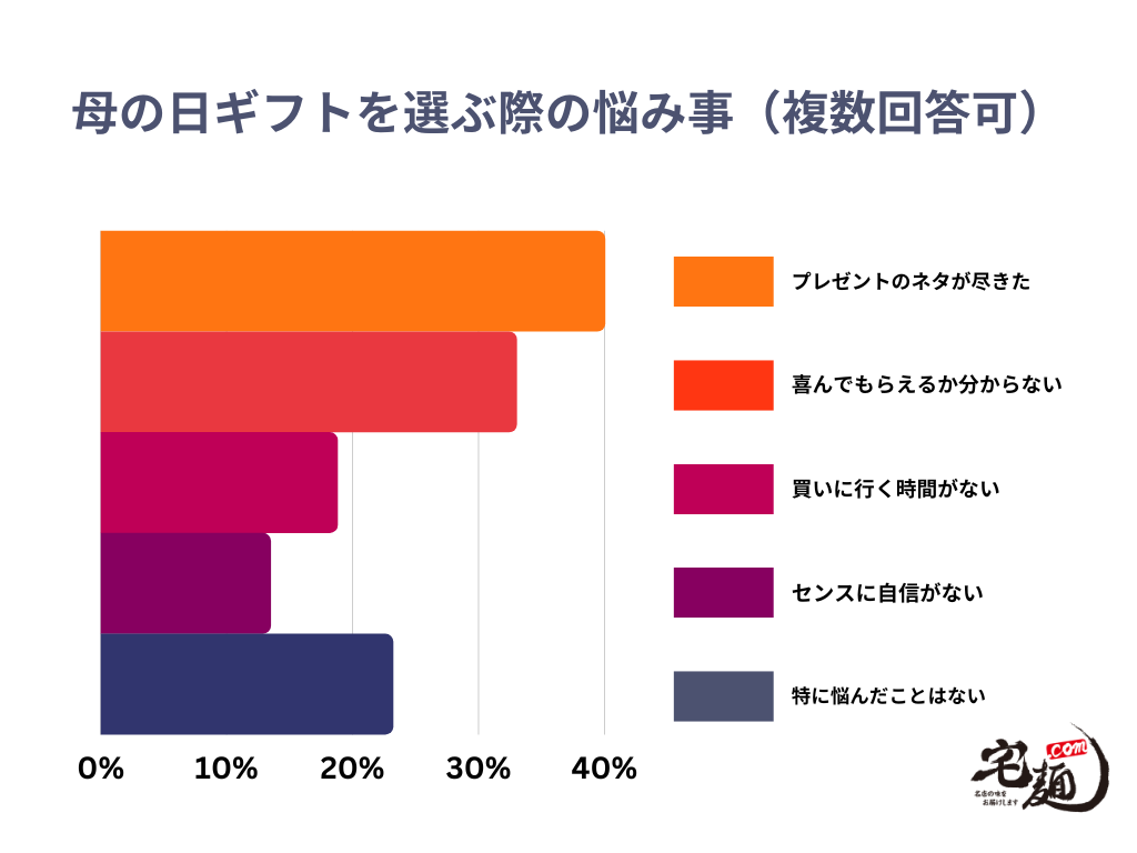 母の日ギフトを選ぶ際の悩みについて聞いたところ、最も多かった回答は「プレゼントのネタが尽きた」(40.1%)という結果となり、定番化してしまったギフト商品にマンネリ感を抱いている層が少なくないことが読み取れます。また、18.8%のユーザーが「ギフトを買いに行く時間がない」と回答し、贈り物を選ぶために店舗に出向くこと自体に負担を感じている様子も伺えます。